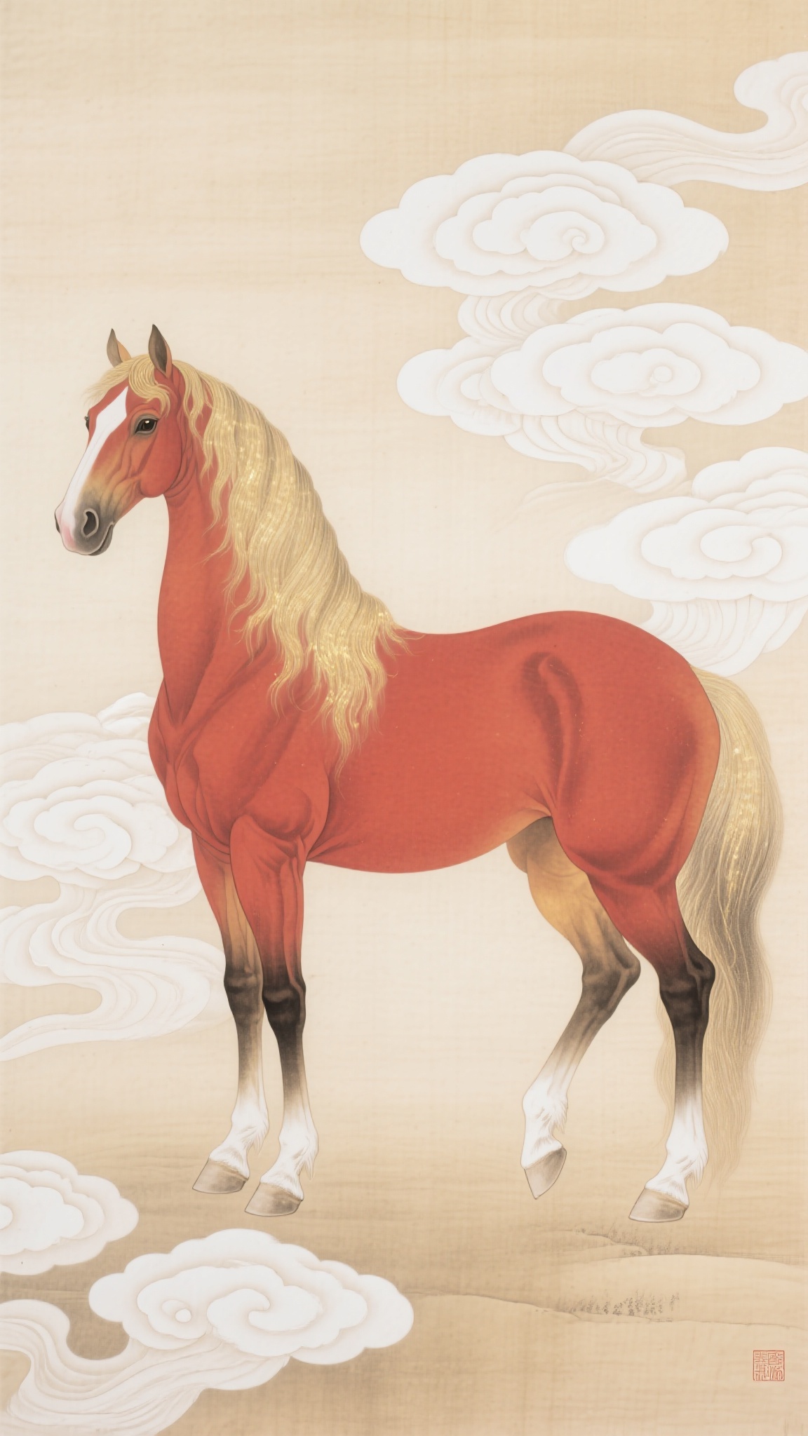 作品描述:工笔风格,金马工笔绘制(线条细腻),色彩典雅(红、金、米白,展示马全身,在画面底部),背景工笔祥云,传统雅致。