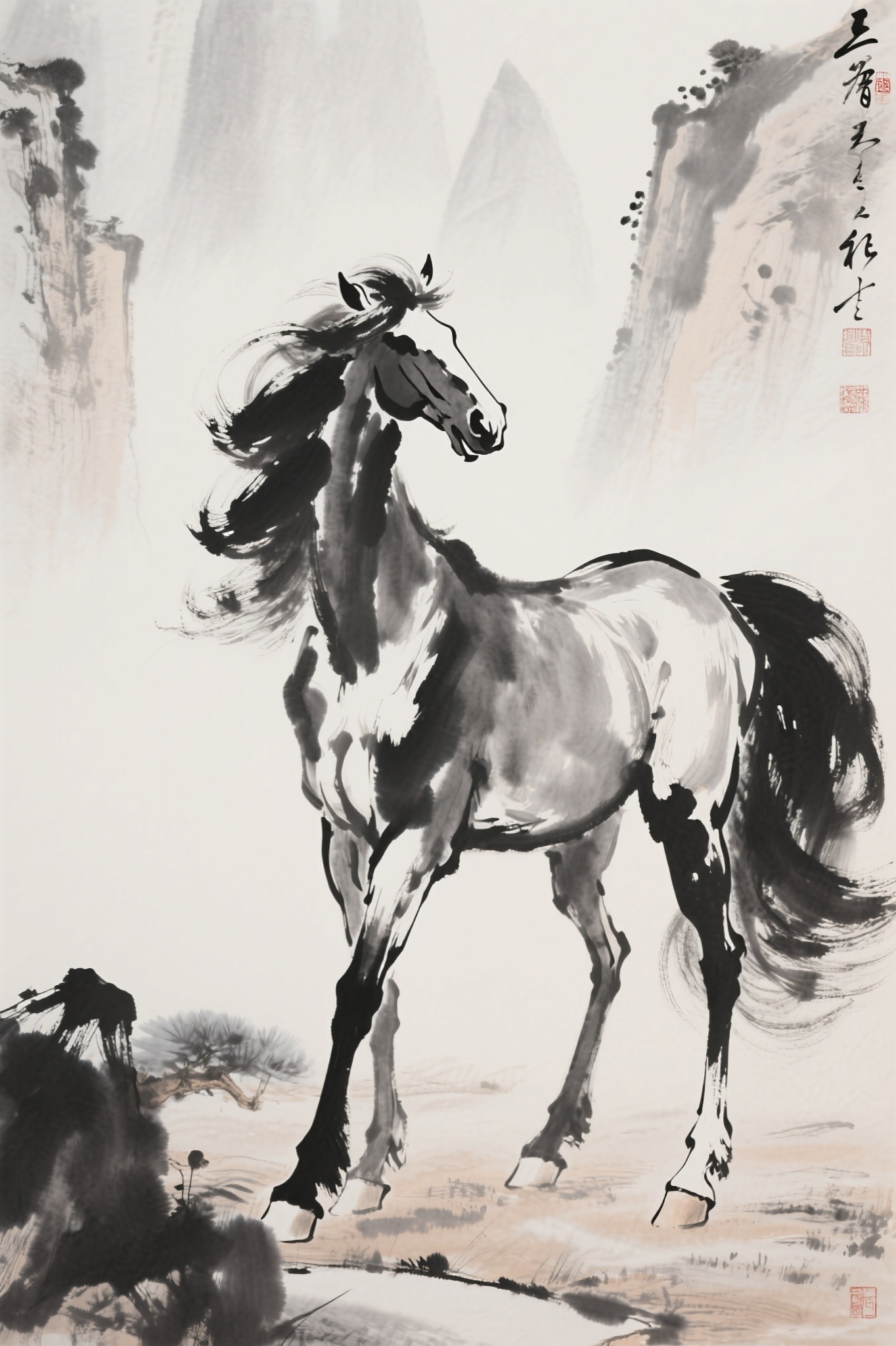 作品描述:水墨写意风格,马身水墨晕染,毛发写意飘逸,背景淡墨山水,中式写意韵味。