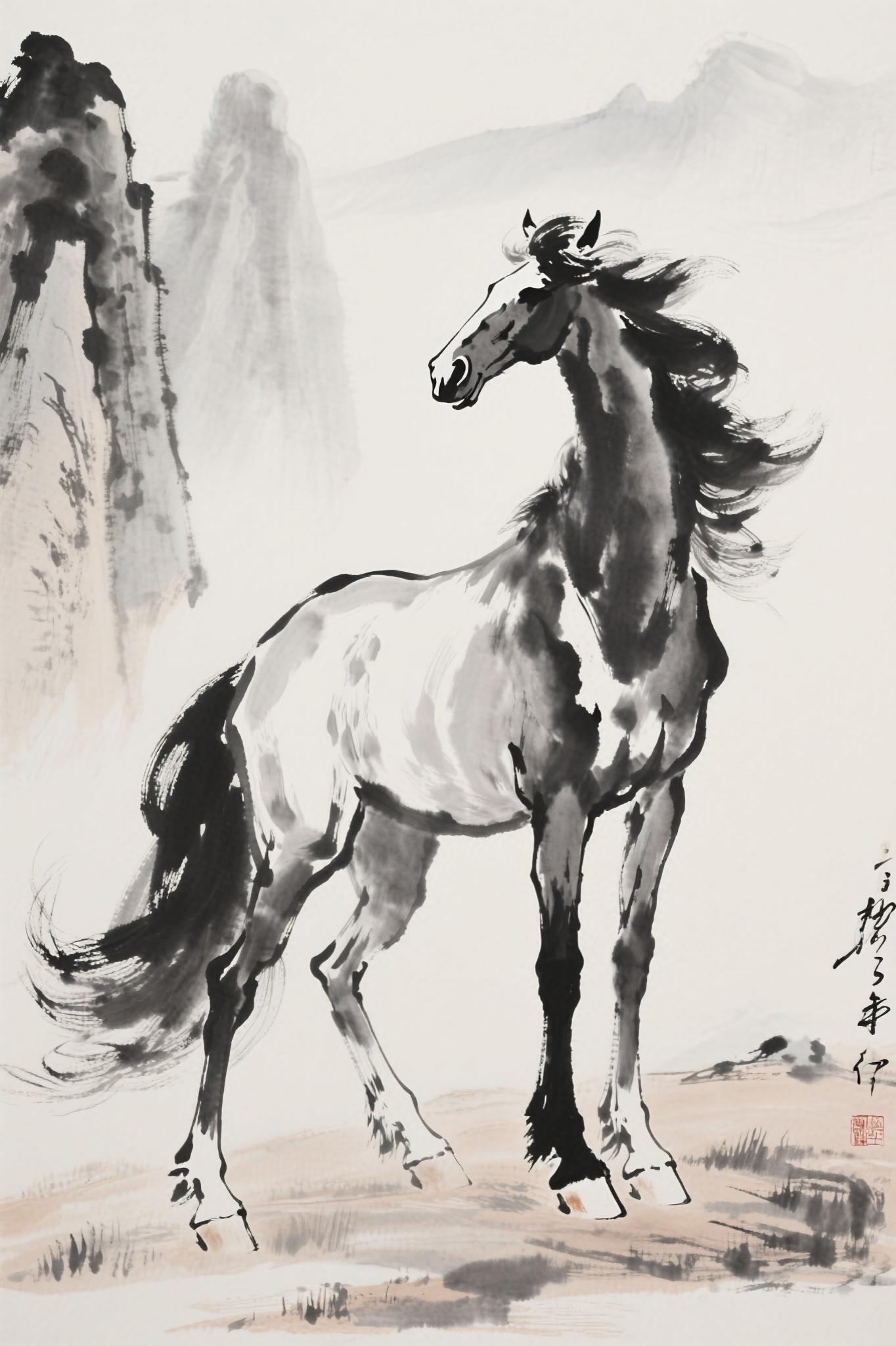 作品描述:水墨写意风格,马身水墨晕染,毛发写意飘逸,背景淡墨山水,中式写意韵味。