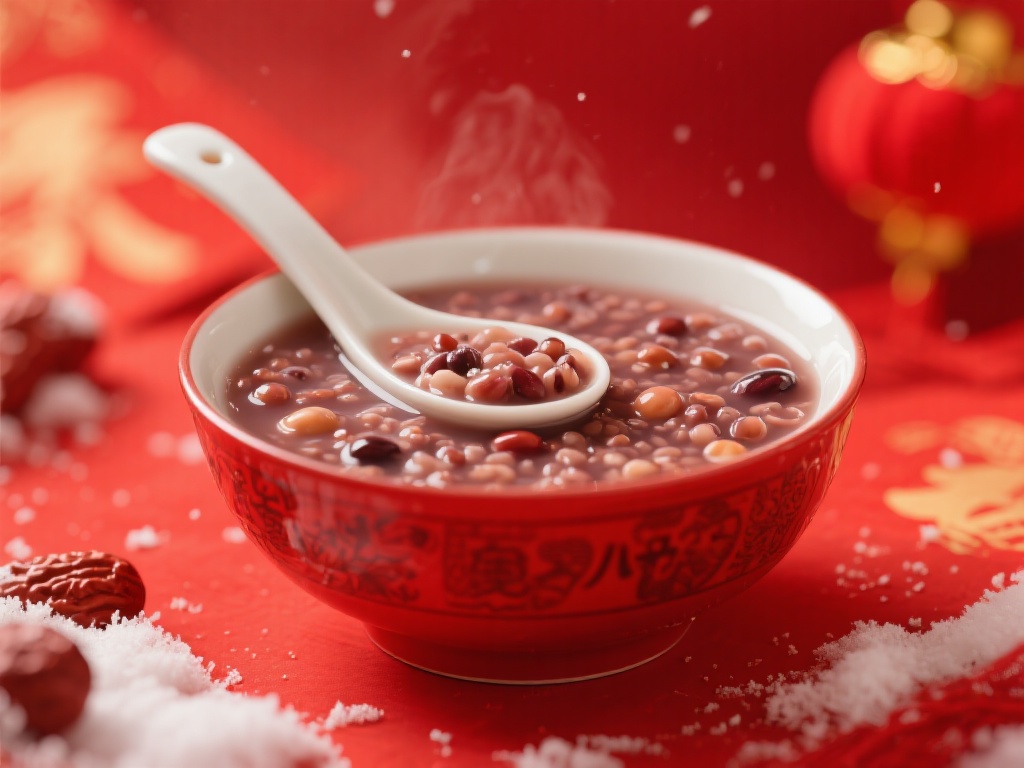 作品描述:过了腊八就是年,腊八节 腊八粥 传统 节日 美食 习俗 餐具 碗 勺子 红色 背景 节庆 氛围 冬季 温暖