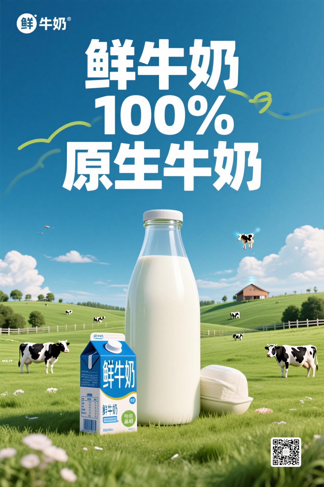 作品描述:牧场实景风海报。绿色牧场背景,大牛奶瓶+盒装奶,奶牛点缀,文案“鲜牛奶 100% 原生牛奶” ,强调原生品质