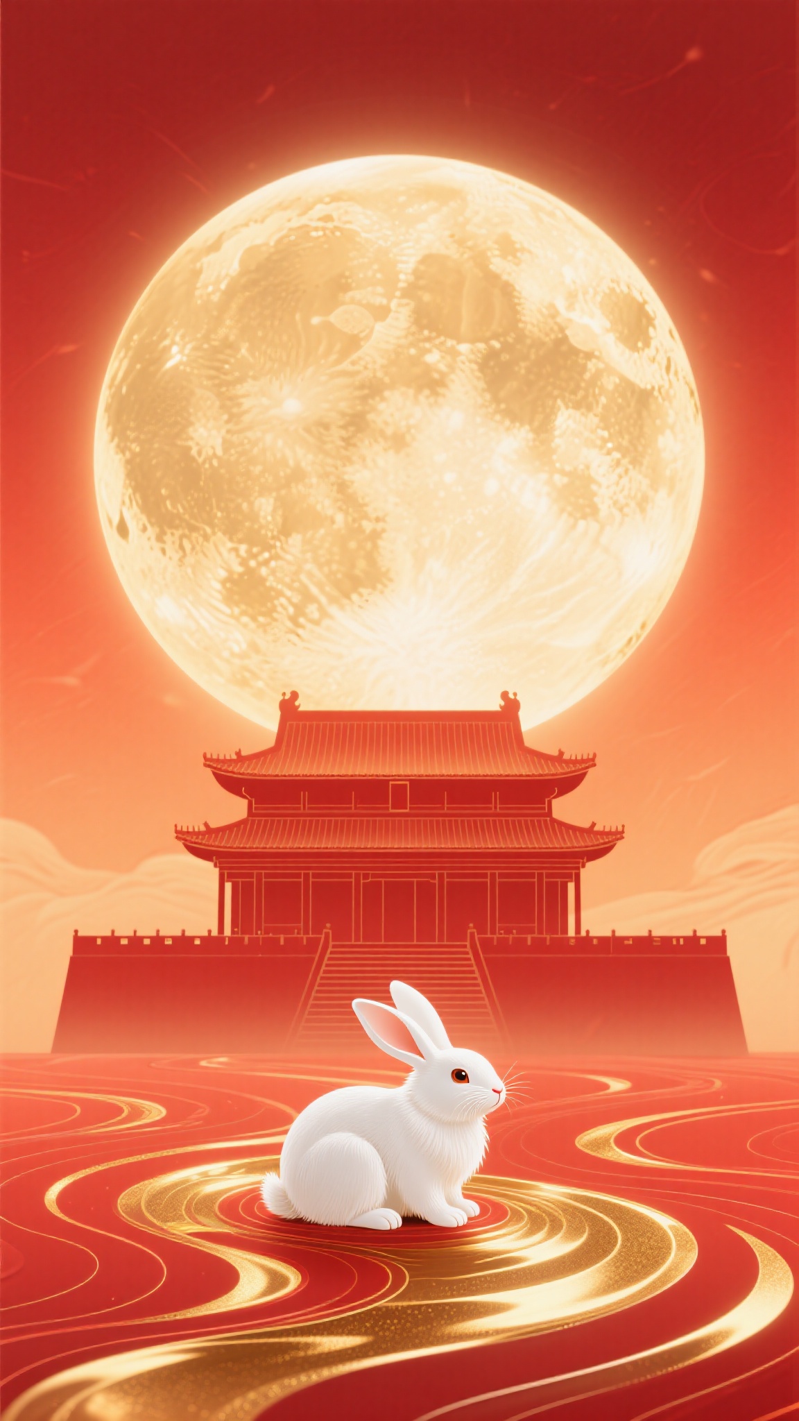 作品描述:国潮插画风格,红橙渐变背景(深红→暖橙自然晕染,如落日余晖),核心构建 鎏金大圆月(表面覆朦胧光晕,似中秋玉盘,边缘带渐变光纹),下方嵌套宫殿剪影(红金渐变,轮廓简约却显庄重,与月形成 “天圆地方” 呼应),搭配 白玉兔(静坐于流动红金波纹之上,姿态悠然,毛发带柔焦光影),波纹 如液态金流(光纹缠绕,连接月与建筑,强化空间纵深感);整体光影柔和通透(月的高光凸显圆润,波纹阴影增强层次)