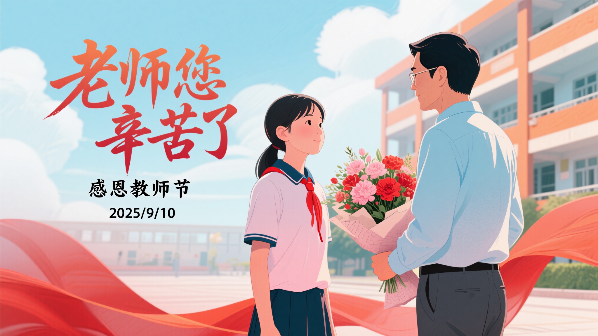 - 主标题“老师您辛苦了”红#DC143C渐变+书法笔意(传真挚),画面左侧偏上,