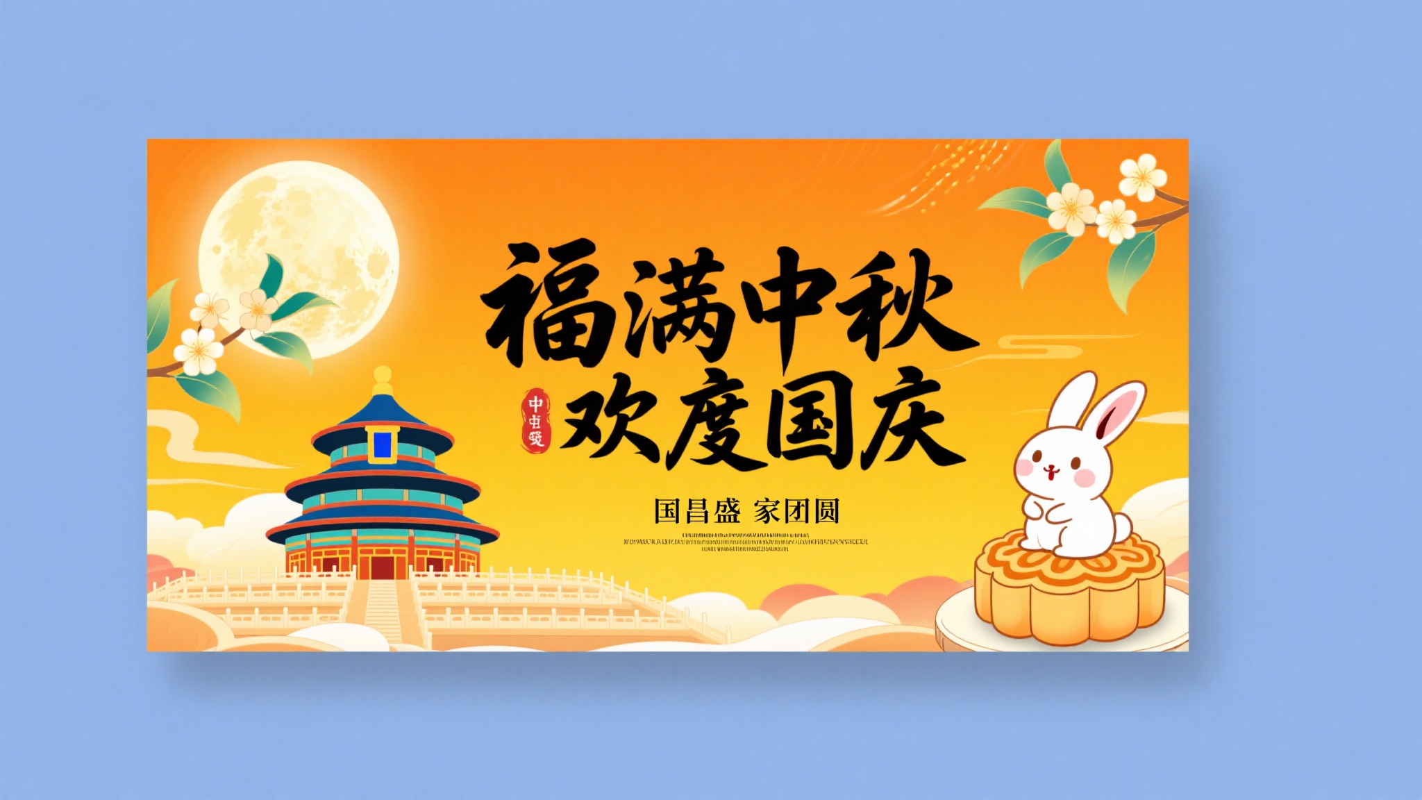 作品描述:中秋国庆主题海报,橙黄色调,包含天坛、圆月、桂花枝、玉兔(坐月饼)等元素,中央黑色书法字体 “福满中秋 欢度国庆”,辅以 “国昌盛 家团圆” 等文字,传递出国家昌盛、家庭团圆的双节美好祝愿。