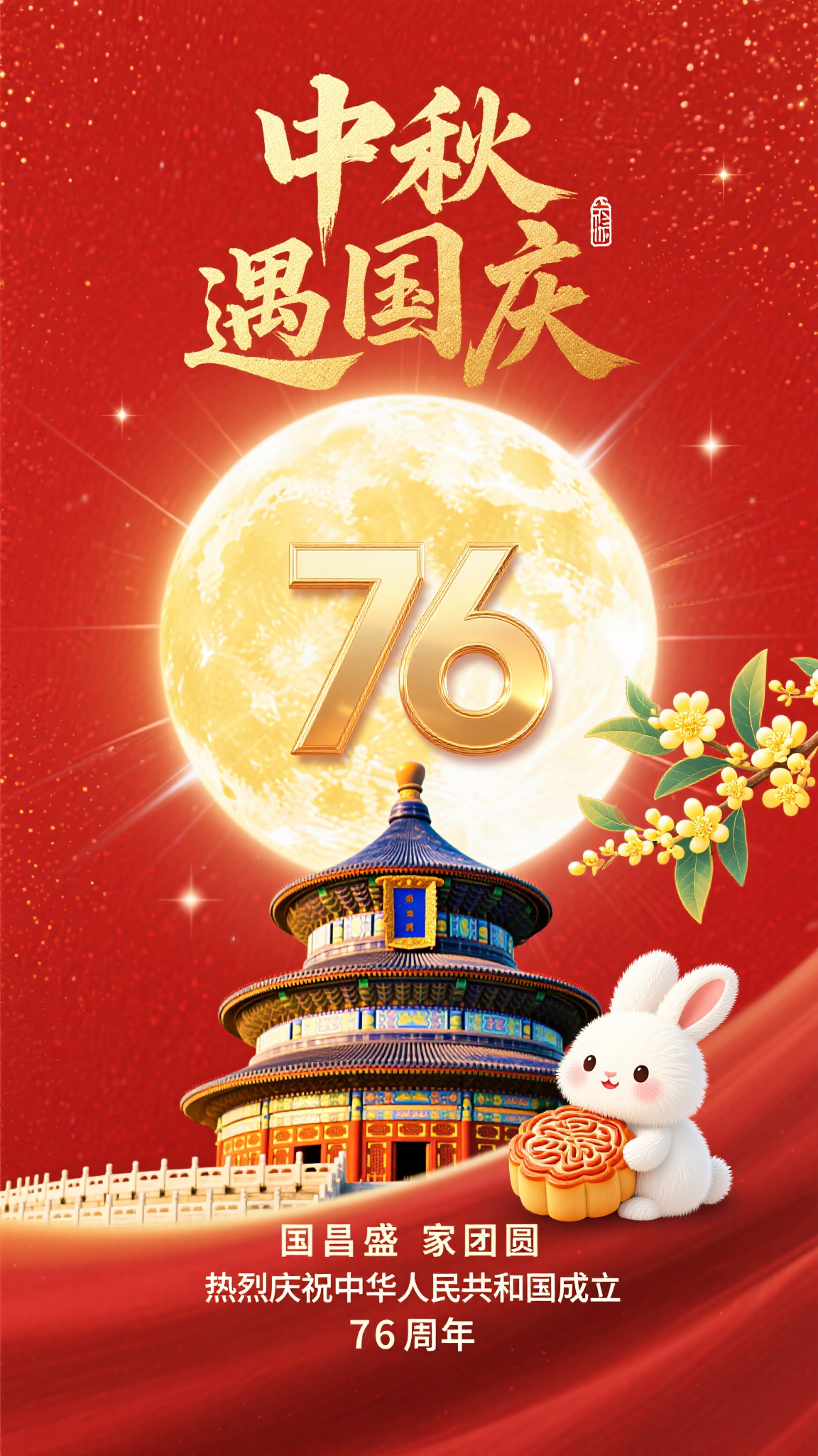 作品描述:中秋遇国庆主题海报,红色背景(带有细腻的星光纹理,增添梦幻感),顶部金色书法字体 “中秋遇国庆”(笔锋灵动,富有传统韵味),中间是巨大的圆月(暖黄色,表面有柔和光晕,仿佛散发着光芒),圆月前有数字 “76” 造型(金色,带有立体光泽,与天坛建筑融合自然),天坛建筑(色彩华丽,飞檐、琉璃瓦等细节精致),左侧有白兔抱月饼的可爱形象(毛发蓬松,神态活泼),还有桂花枝(花朵金黄,叶片翠绿,点缀其间),下方文字 “国昌盛 家团圆 热烈庆祝中华人民共和国成立 76 周年”(字体清晰,排版整齐),整体氛围喜庆热烈,充满双节同庆的欢乐感。
