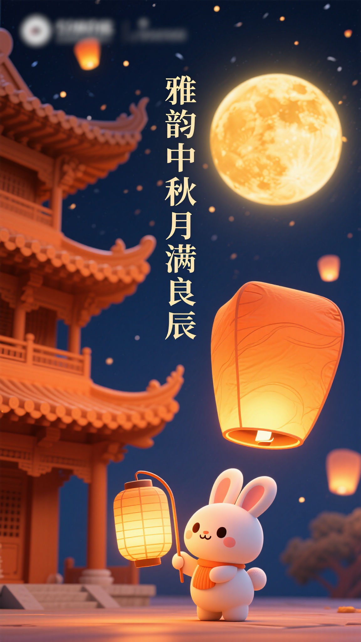 作品描述:竖版海报,3D 卡通风格,暖橙色夜空下,透光效果明显的橙黄玉盘圆月旁,古建剪影(飞檐翘角清晰)矗立,Q 萌玉兔提灯(灯笼暖光柔和),孔明灯漂浮空中,文字 “雅韵中秋 月满良辰”,营造童趣温馨的中秋夜。