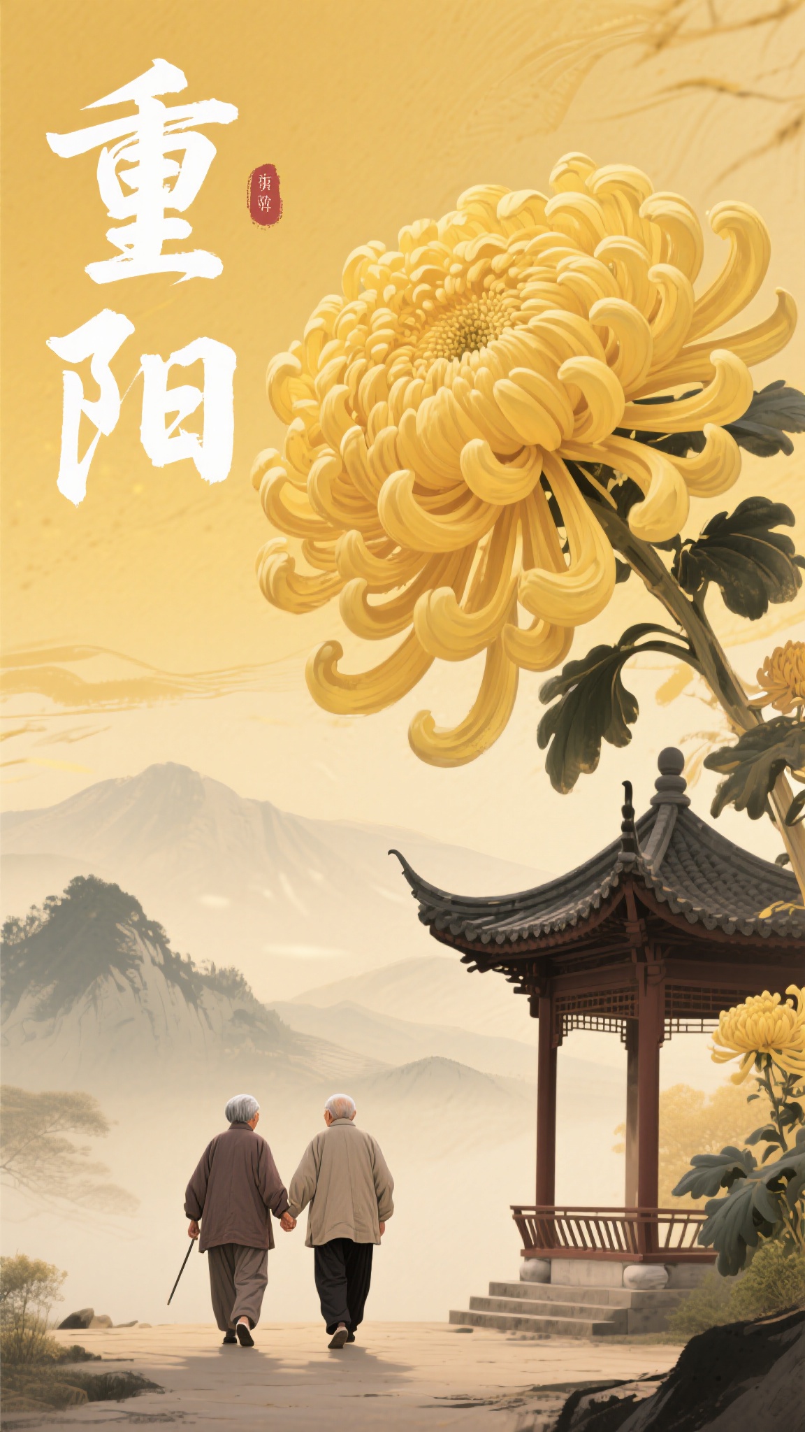作品描述:竖版海报,国潮写意风格,暖黄色调背景,巨型金黄菊花,下方古亭旁一对老人牵手漫步,远处山峦朦胧如淡墨,“重阳” 笔触飞白有动感,优化细节:菊花的蓬松感强化,老人衣纹褶皱更自然。