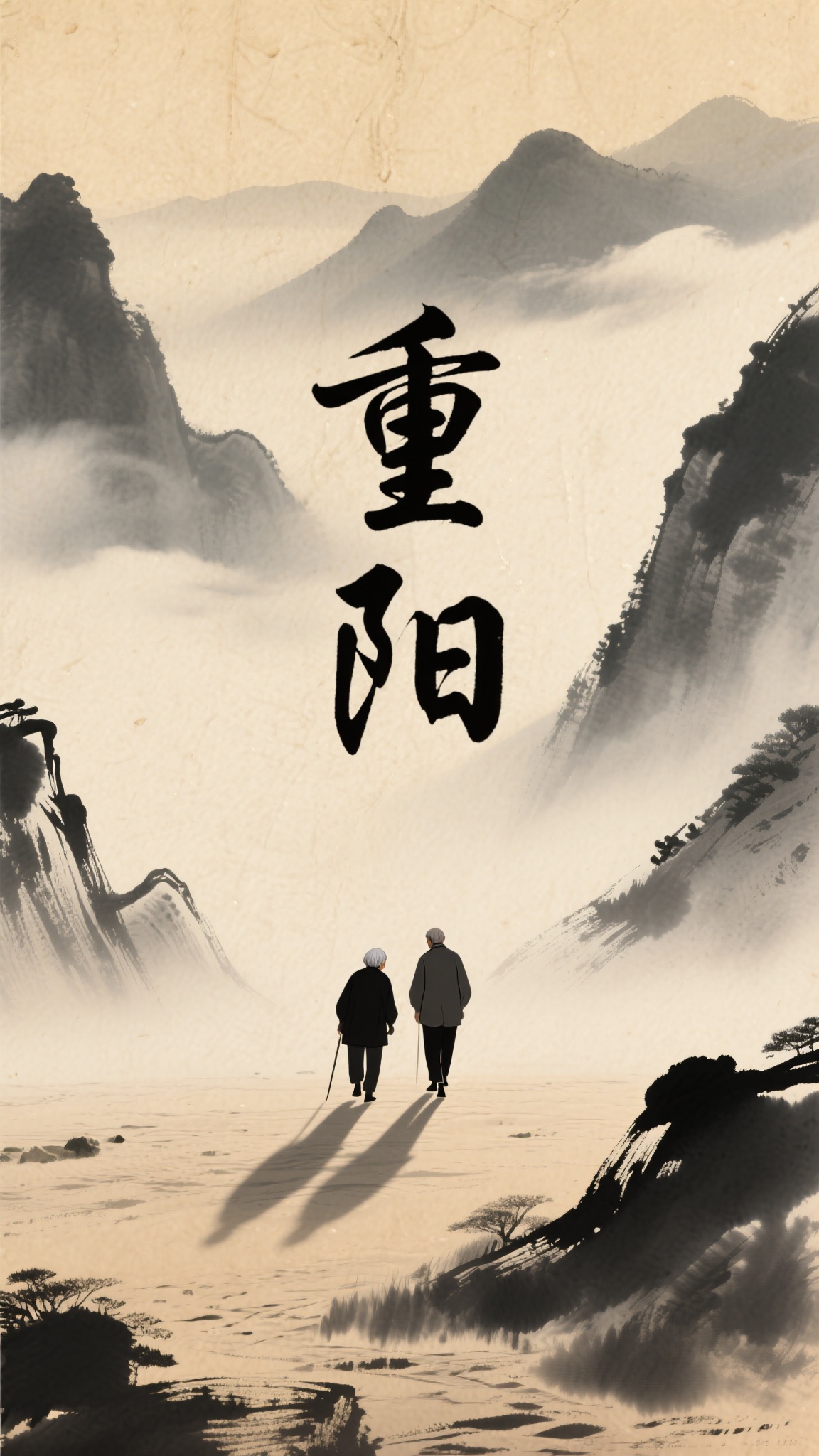 作品描述:竖版海报,水墨晕染风格,米黄色做旧纸底,“重阳” 书法字(墨色浓淡如晕染云雾),下方一对老人在水墨山峦间漫步(影子被拉得修长,与地面纹理融合),优化细节:水墨笔触的干湿变化更明显,老人轮廓边缘做虚焦处理增强意境。