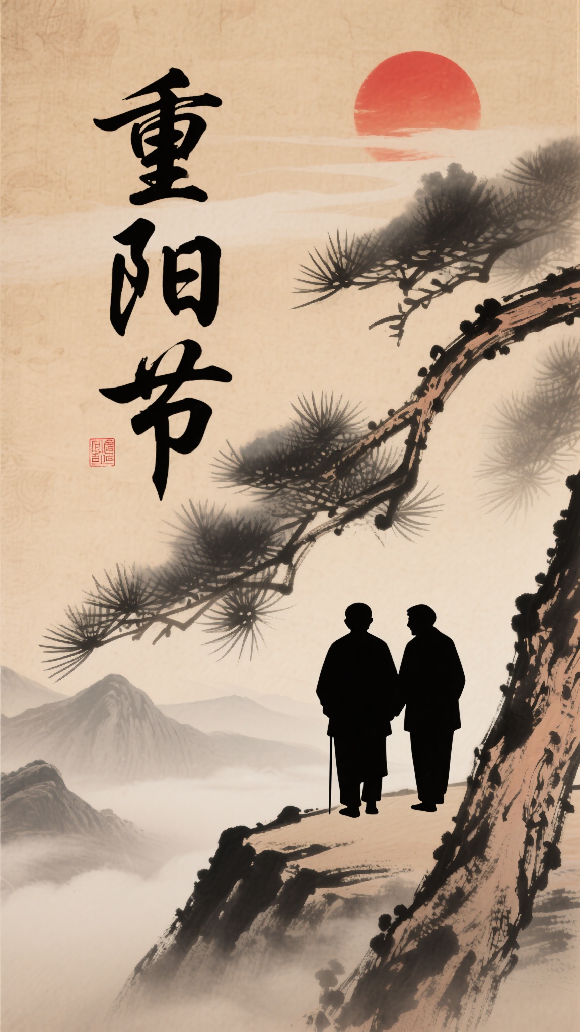 作品描述:竖版海报,古风写意风格,浅棕色宣纸底,苍劲的松枝斜出(松针用细笔勾勒质感),红日如丹砂点缀天际,一对老人剪影在山间(轮廓边缘融于水墨云雾),“重阳节” 书法字笔势狂放,优化细节:松枝的皴擦纹理更具古意,云雾的晕染范围更朦胧。