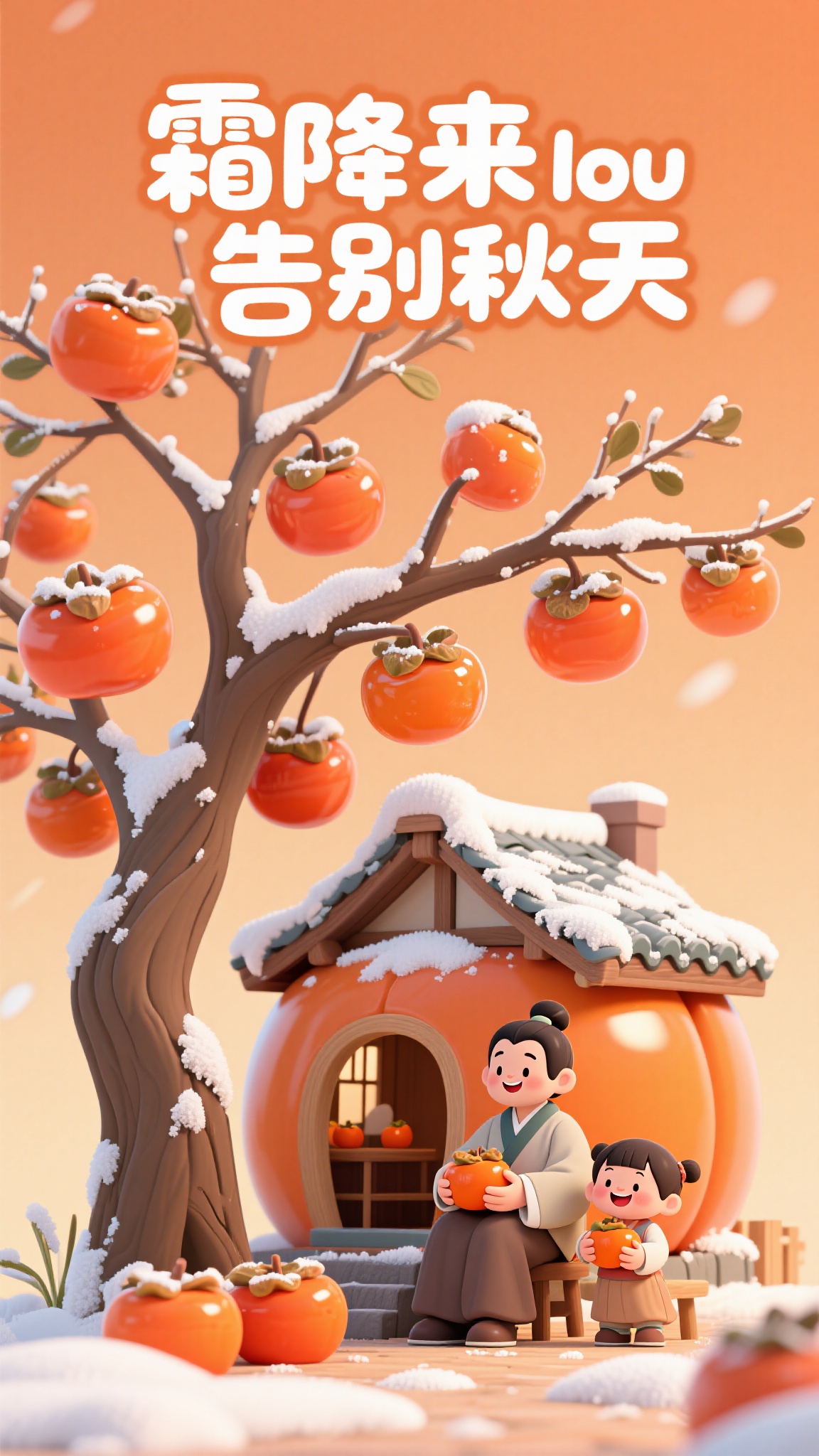 作品描述:竖版海报,卡通童趣风格,暖橙渐变背景,结满带薄霜、水润光泽橙红柿子的树,树下是柿子造型的小屋(屋顶霜层纹理细腻),屋内古风人物静坐,旁有孩童抱柿子欢笑,“霜降来 lou 告别秋天” 用圆润卡通字体,优化:强化柿子霜花颗粒感与人物表情生动度。