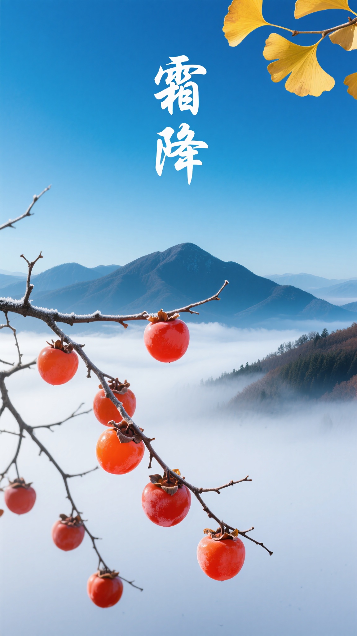 作品描述:竖版海报,写实风景风格,湛蓝天空下,云雾层次晕染的远山前,枯枝挂着柿面霜粒清晰(透光质感)的红柿,右上角金黄银杏叶点缀,“霜降” 飘逸白字,优化:云雾晕染层次与柿霜透光质感。