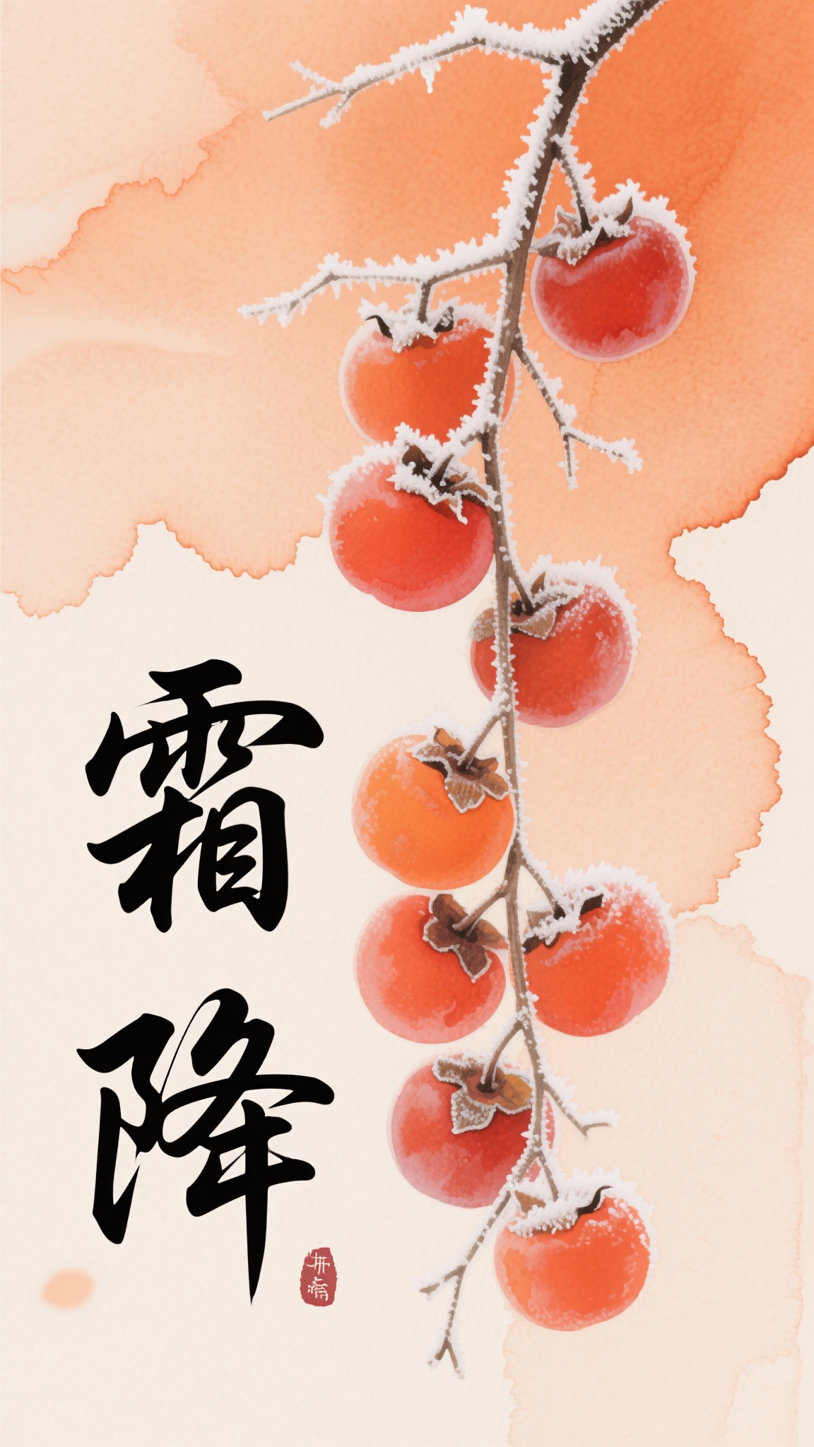 作品描述:竖版海报,水彩治愈风格,暖橙水彩底,水彩晕染自然、霜层如淡薄纱的叠放红柿,,细枝垂落小柿,“霜降” 书法字,优化:水彩晕染边界与霜层透明质感。