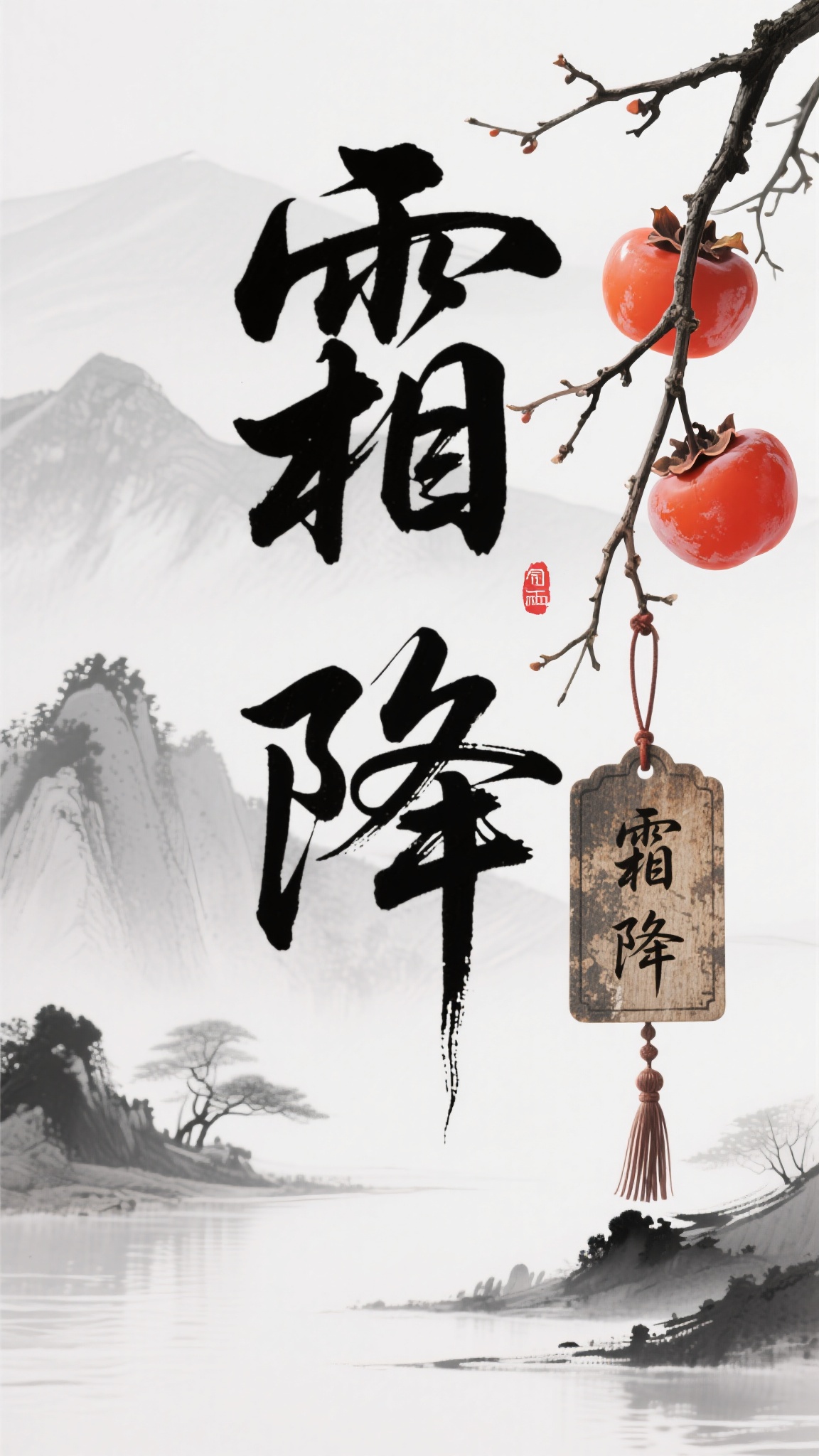 作品描述:竖版海报,古风意境风格,灰白水墨山水背景,带红柿与古朴字迹祈福牌的柿子枝,“霜降” 枯藤般狂草字体,优化:水墨山水留白意境与祈福牌做旧纹理。