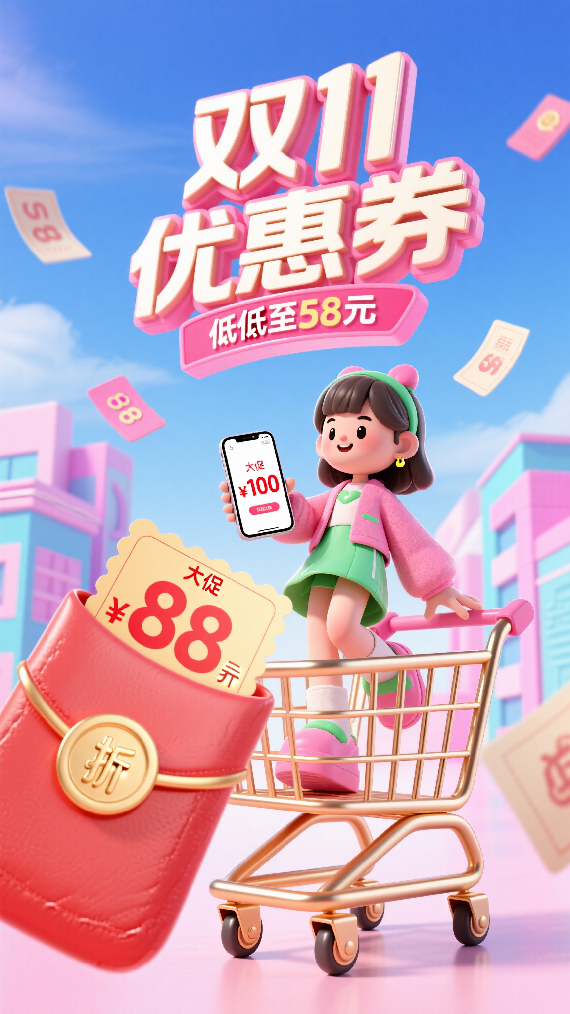 作品描述:竖版海报,3D 卡通风格,明亮蓝粉渐变天空为背景,巨型带金属光泽与柔软皮质质感的粉色购物车载着穿粉绿服饰的卡通女孩,女孩手持屏幕光影清晰、显示 “100” 券的手机,周围漂浮纸质纹理带光泽的 “双 11 优惠券 88 元” 卡片(卡片有飘带动效),前景是红金浮雕质感的大红包(“双 11 大促 低至 5 折” 字体立体醒目),背景是糖果色几何建筑,优化细节:购物车的反光层次、红包的浮雕纹理、优惠券的动态飘感。