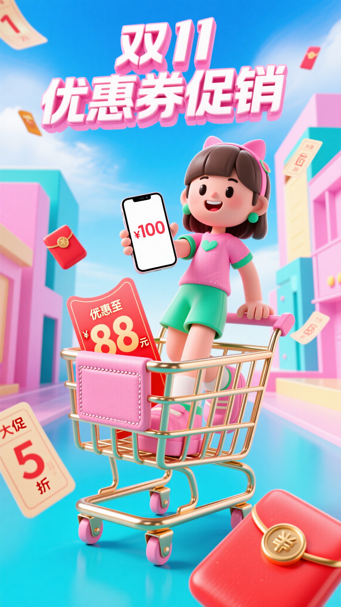 作品描述:竖版海报,3D 卡通风格,明亮蓝粉渐变天空为背景,巨型带金属光泽与柔软皮质质感的粉色购物车载着穿粉绿服饰的卡通女孩,女孩手持屏幕光影清晰、显示 “100” 券的手机,周围漂浮纸质纹理带光泽的 “双 11 优惠券 88 元” 卡片(卡片有飘带动效),前景是红金浮雕质感的大红包(“双 11 大促 低至 5 折” 字体立体醒目),背景是糖果色几何建筑,优化细节:购物车的反光层次、红包的浮雕纹理、优惠券的动态飘感。