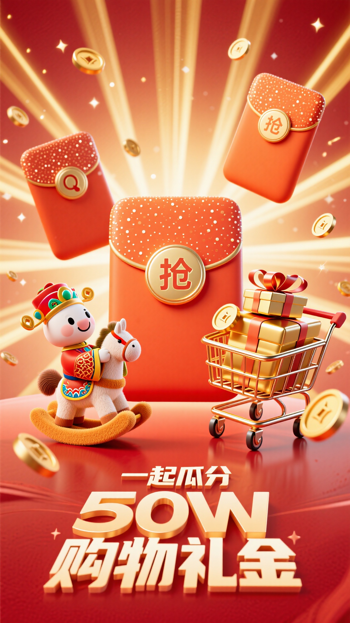 作品描述:3D 卡通风格,红金放射状光纹渐变背景(增强促销氛围),三座表面带细腻星光颗粒的橙红立体红包,中间红包 “抢” 字按钮圆润有通透光泽,左侧 Q 版财神骑毛绒质感小马(财神服饰有刺绣纹理细节),右侧金色金属网格反光的购物车堆满丝带光泽流动的礼盒,金币(金属反光动态四散)飘落,底部 “一起瓜分 50W 购物礼金” 字体饱满有立体感,优化细节:红包的星光颗粒动态、财神服饰的刺绣质感、购物车金属网格的反光层次。