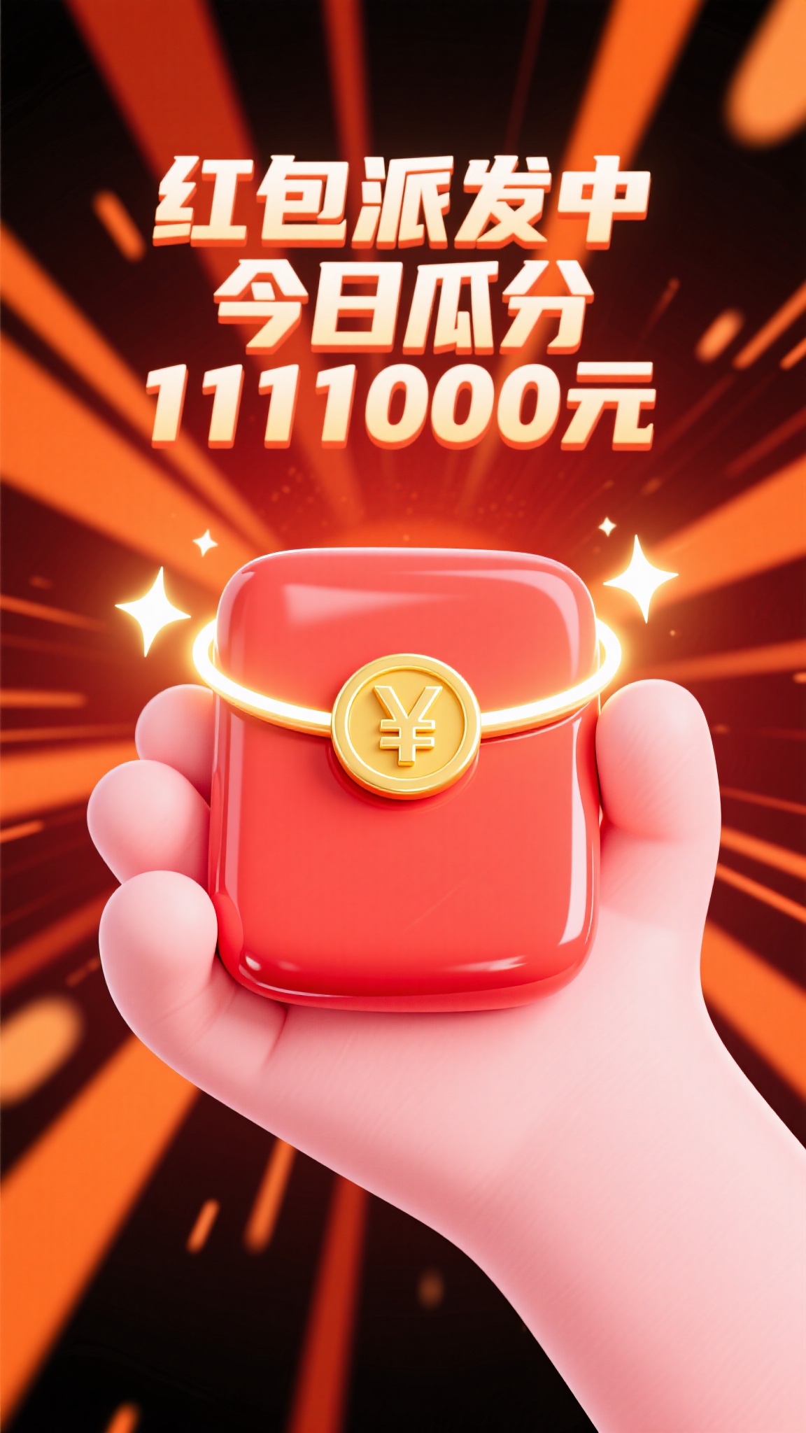 作品描述:3D 卡通科技风格,肉粉色卡通手掌托着红釉质感红包(嵌金黄 “” 金属扣,环绕发光星环),橙红放射状光效背景增强动感,“红包派发中 今日瓜分 1111000 元” 用圆润立体字。优化:红包釉面反光、星环光晕渐变、手掌软萌质感。