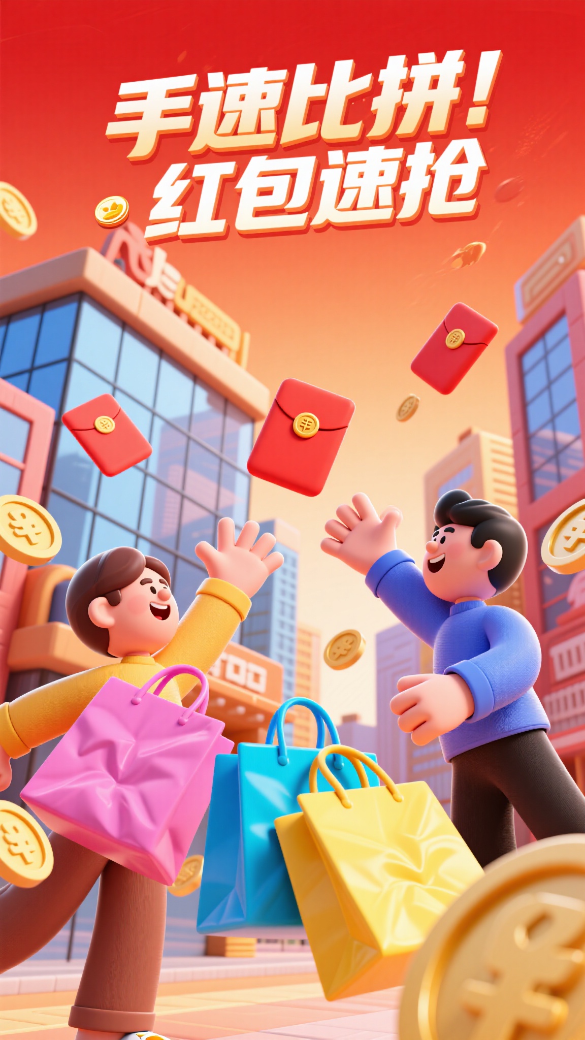 作品描述:卡通 3D 场景风格,红橙渐变购物城市背景(建筑带玻璃反光),卡通人物伸手抢带飘带动画的红包,彩色购物袋(粉 / 蓝 / 黄)与金币环绕,“手速比拼 红包速抢” 用活泼卡通字体。优化:人物动态姿态、购物袋褶皱质感、建筑玻璃反光。