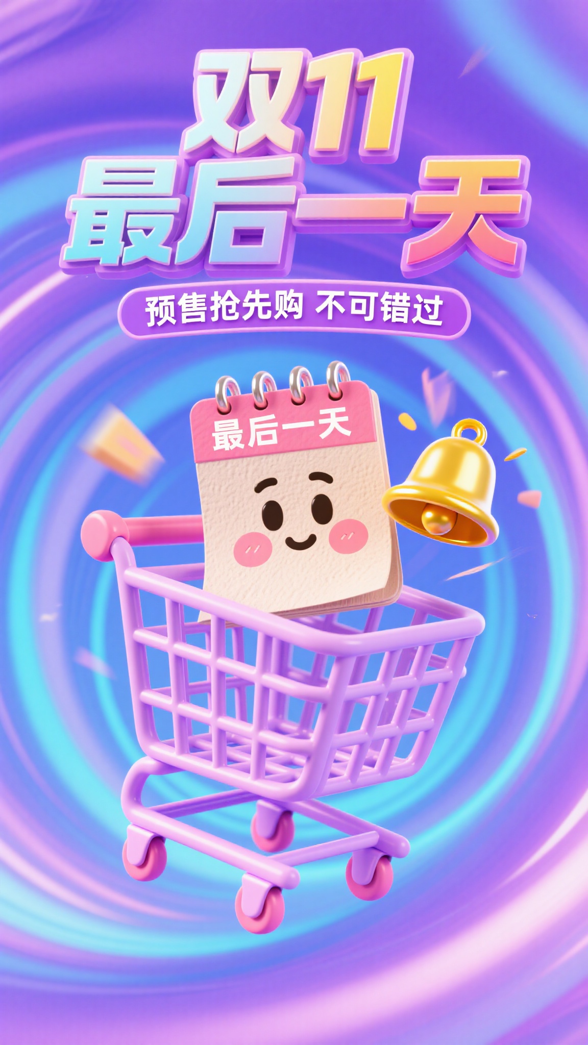 作品描述:梦幻紫蓝风格,紫蓝光效漩涡背景,粉紫描边镂空购物车承载带卡通腮红、纸质纹理的 “最后一天” 日历牌,悬浮金属光泽黄铃铛(碰撞动态),“双 11 预售抢先购 不可错过” 用渐变立体字。优化:购物车描边光、日历牌卡通表情、铃铛反光。