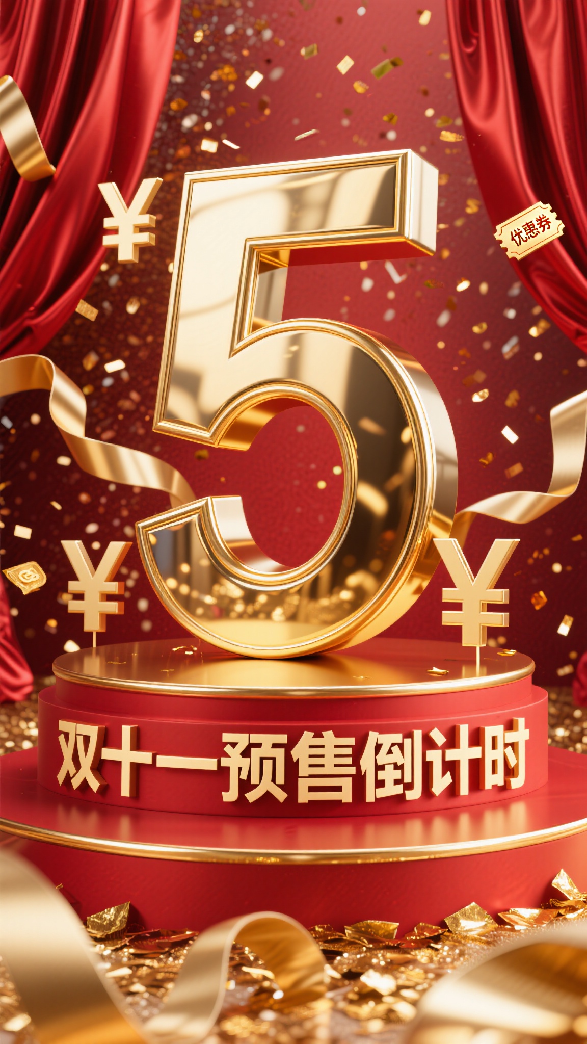 作品描述:奢华红金风格,亮红金箔碎屑背景,** 鎏金镜面反光 “5” 字(边缘描金)** 立于红金双层舞台,环绕丝绸质感金色彩带、烫金 “” 优惠券,“双十一预售倒计时” 用厚重立体字。优化:数字镜面反光、彩带丝绸褶皱、优惠券烫金质感。
