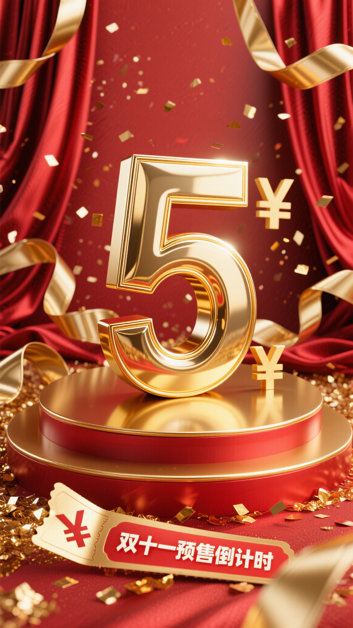 作品描述:奢华红金风格,亮红金箔碎屑背景,** 鎏金镜面反光 “5” 字(边缘描金)** 立于红金双层舞台,环绕丝绸质感金色彩带、烫金 “” 优惠券,“双十一预售倒计时” 用厚重立体字。优化:数字镜面反光、彩带丝绸褶皱、优惠券烫金质感。