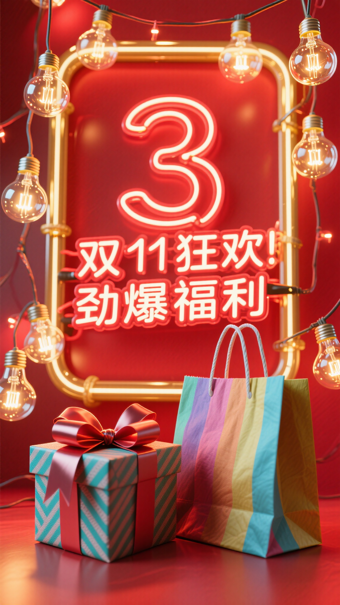 作品描述:节日氛围风格,正红灯泡串(暖光玻璃质感)背景,红金霓虹灯框内发光灯管效果的 “3” 字,搭配彩色布料纹理购物袋、缎带蝴蝶结礼盒,“双 11 狂欢 劲爆福利” 用霓虹灯字体。优化:灯泡玻璃反光、礼盒蝴蝶结褶皱、购物袋布料纹理。