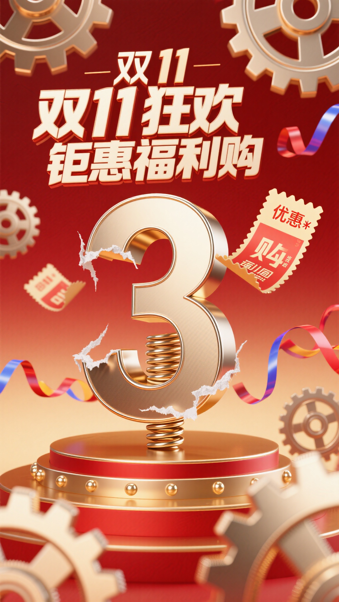 作品描述:机械金属风格,红金渐变背景,齿轮弹簧结构、金属光泽的 “3” 字立于红金舞台,飞着撕边质感优惠券、金属卷曲彩带,“双 11 狂欢 钜惠福利购” 用金属立体字。优化:机械字齿轮联动、优惠券撕边、彩带金属反光。