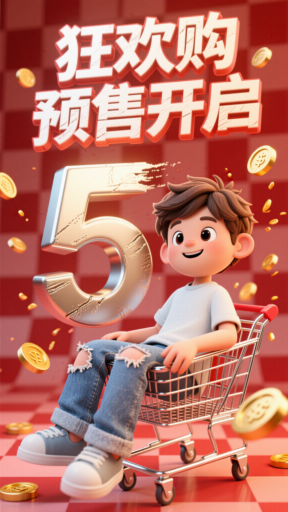 作品描述:3D 卡通人物风格,红格纹背景,穿柔软牛仔破洞裤的卡通男孩坐金属网格购物车,旁有毛笔毛糙质感 “5” 字,金属反光金币飞溅,“狂欢购 预售开启” 用卡通字体。优化:购物车金属网格、金币反光。