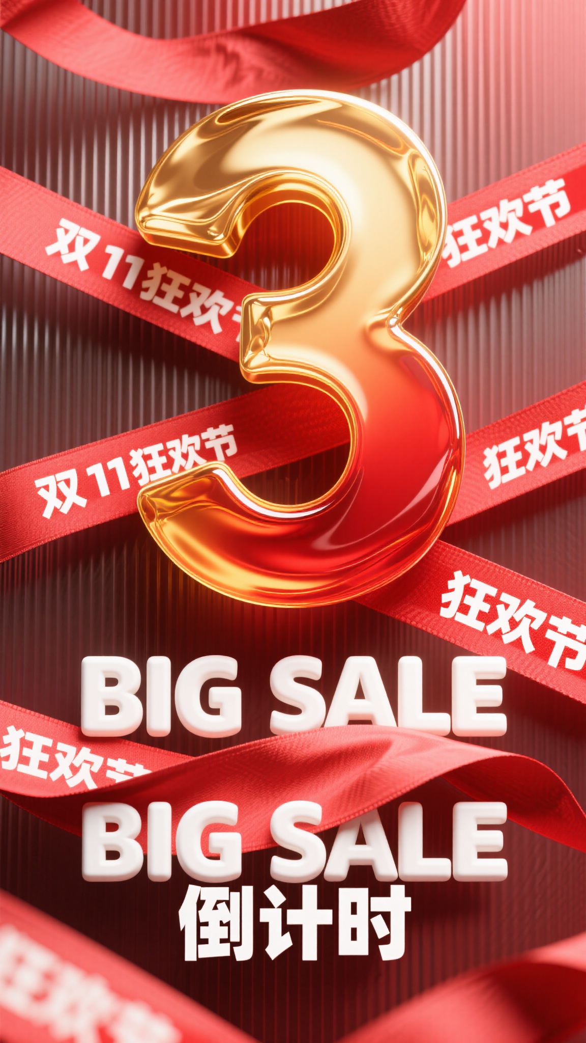 作品描述:红金渐变磨砂条纹背景,中心是流体琥珀质感、金红渐变的 “3” 字(表面有液态流动光泽),多条红底白字 “双 11 狂欢节” 丝带斜穿(丝带含褶皱与阴影),下方 “BIG SALE 倒计时” 白字具立体厚度,底部促销文字清晰。优化细节:流体字液态光泽、丝带褶皱阴影、背景条纹磨砂质感。