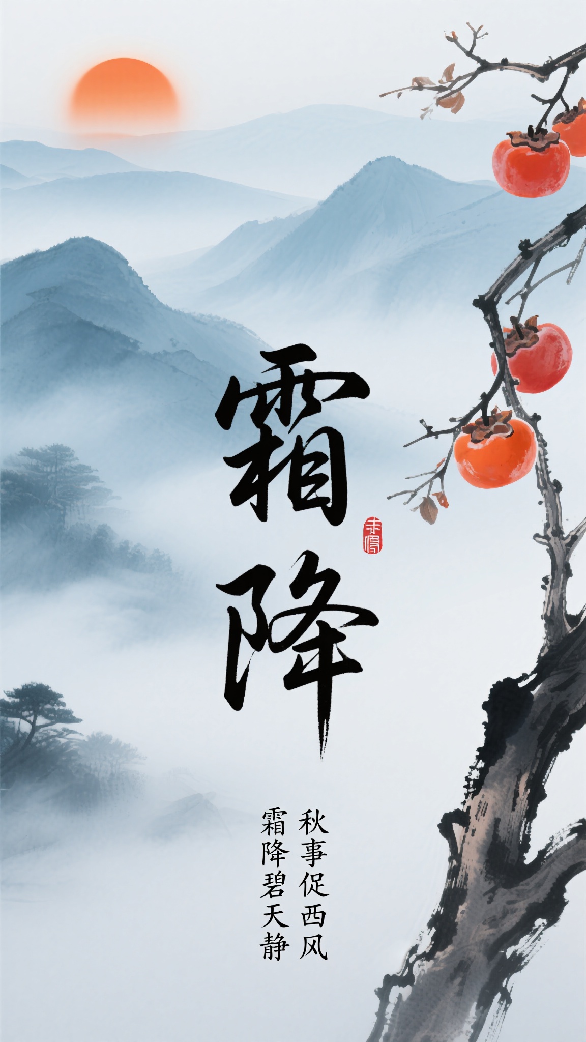 作品描述:新中式山水风格,淡蓝水墨远山(云雾层次朦胧),左上方橙红旭日(光晕柔和渐变),右侧苍劲柿枝(挂红柿、枝干带皴擦纹理),中间狂草 “霜降” 书法字(墨色泼墨感、飞白灵动),下方配 “霜降碧天静 秋事促西风” 小字。优化细节:优化山水云雾晕染层次、书法狂草飞白动态、柿枝皴擦纹理。