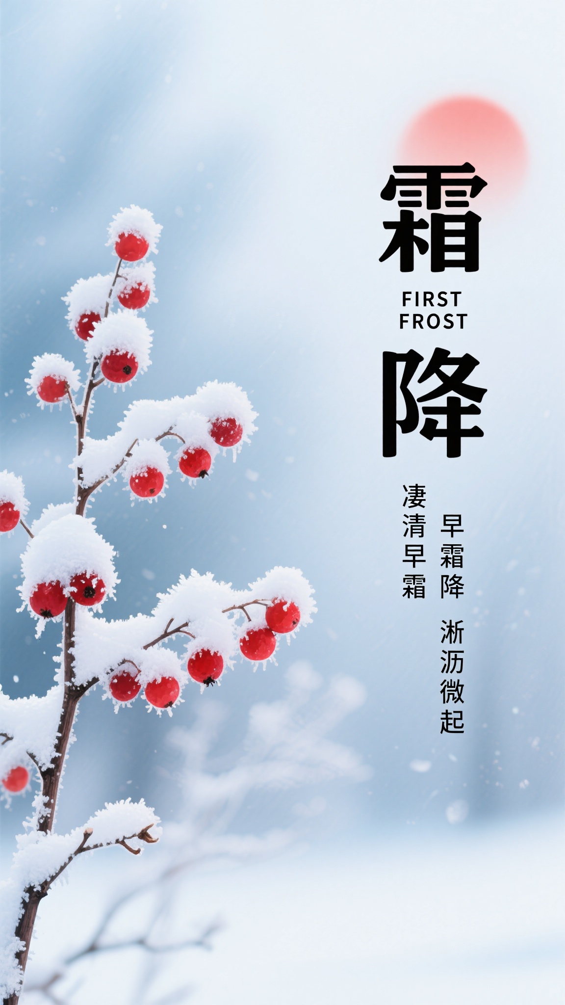 作品描述:梦幻水彩风格,淡蓝渐变背景(霜雾朦胧感),左侧覆雪的红果枝(浆果鲜红、雪层蓬松),右侧 “霜降” 黑体字(旁注英文 “FIRST FROST”),下方竖排 “凄清早霜降 淅沥微风起” 小字,红日半隐于雾中。优化细节:强化雪层蓬松质感、浆果鲜艳通透、霜雾朦胧渐变。