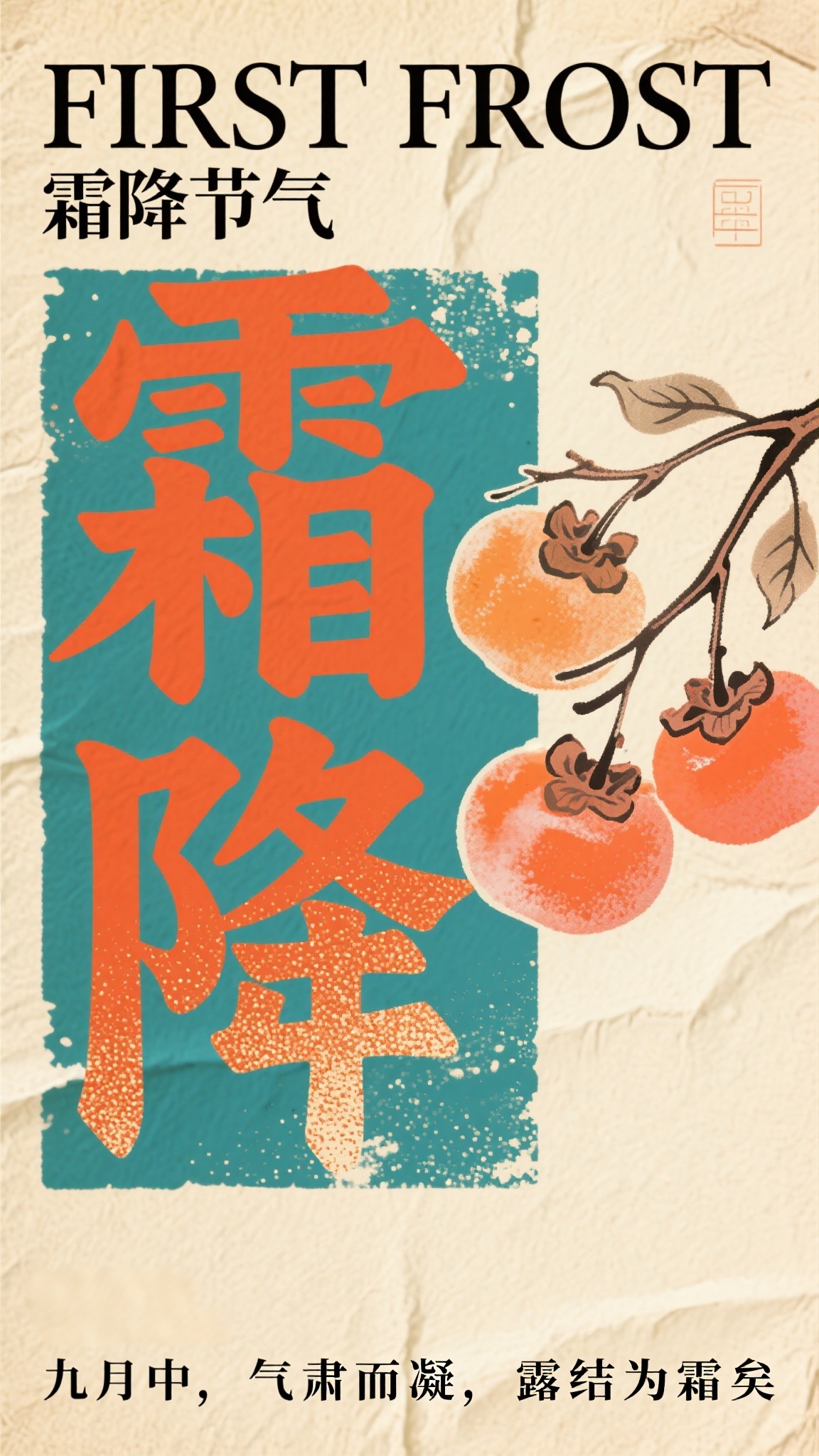 作品描述:复古印刷风格,米黄色做旧纸背景,上方 “FIRST FROST 霜降节气” 英文 + 中文,中间大块面拼接的 “霜降” 艺术字(橙红渐变、带颗粒印刷感),右侧手绘柿枝(果实带晕染纹理),下方标注日期与 “九月中,气肃而凝,露结为霜矣” 古文。优化细节:强化做旧纸斑驳感、艺术字印刷颗粒、柿枝晕染纹理。
