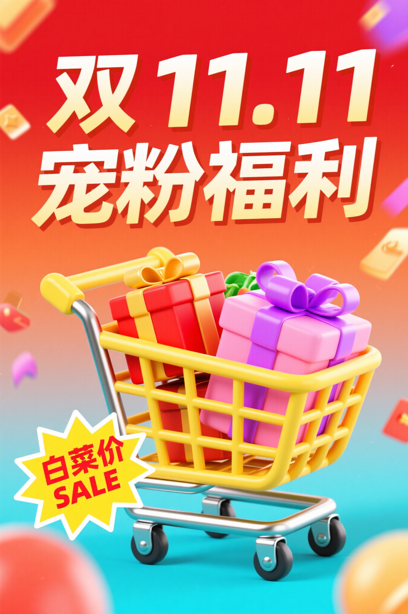 作品描述:3D 卡通风格,竖版海报,暖红到橙渐变背景,亮黄色立体购物车(金属光泽、滚轮细节清晰)装满彩色礼盒(红 / 粉 / 紫,丝带褶皱真实),上方 “双 11.11 宠粉福利” 立体加粗字体,左下角 “白菜价 SALE” 爆炸形标签(边缘锯齿状、色彩鲜亮),整体氛围热闹促销。
