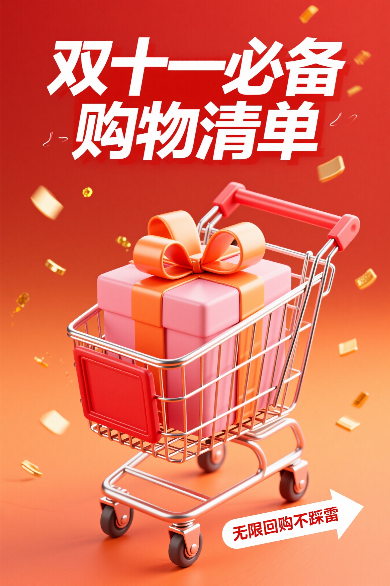 作品描述:活力促销风格,竖版海报,红橙渐变背景(带金色粒子漂浮),红色 3D 购物车(金属网格、滚轮动态感)装满粉 / 橙礼盒(丝带蝴蝶结立体),上方 “双十一必备 购物清单” 粗体字,右下角 “无限回购不踩雷” 白色箭头标签。