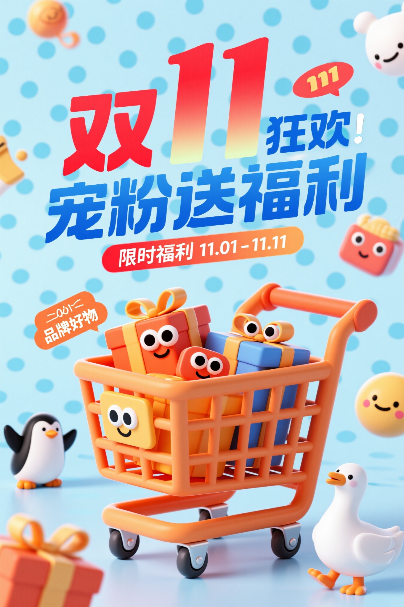 作品描述:3D 卡通风格,竖版海报,浅蓝圆点背景,“双 11 狂欢 宠粉送福利” 红蓝渐变活泼字体,橙色卡通购物车(带网格纹理、滚轮细节)装满带眼睛表情的拟人化礼盒,搭配企鹅、白鹅等可爱 3D 动物元素,“限时福利 11.01 - 11.11”“品牌好物” 等促销标签点缀,整体氛围热闹童趣。