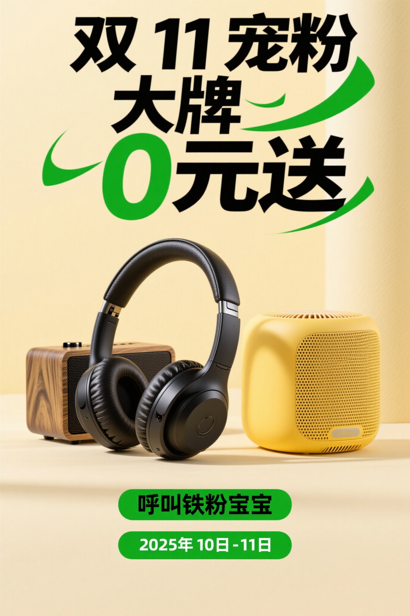 作品描述:实用种草风格,竖版海报,浅黄背景,“双 11 宠粉 大牌 0 元送” 黑绿艺术字,展示复古木质蓝牙音箱(纹理清晰)、黑色头戴式蓝牙耳机(皮质耳罩质感)、黄色智能音箱(网格细节),“呼叫铁粉宝宝” 绿色标签引导,下方标注 “2025 年 10 日 - 11 日” 活动时间,风格简洁易读。