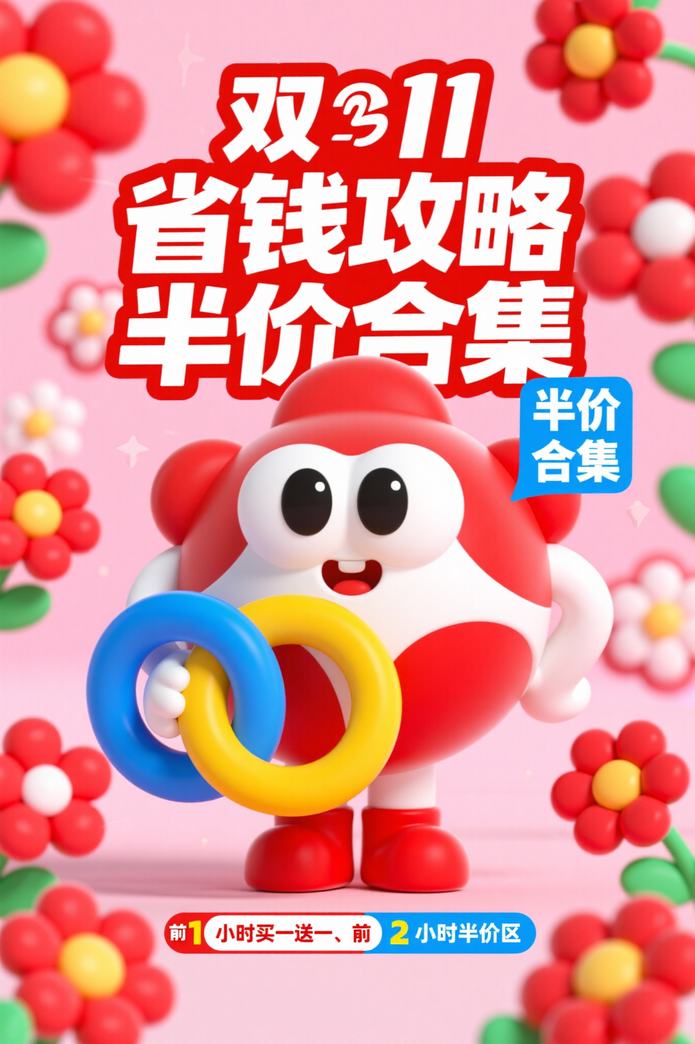 作品描述:3D 趣味风格,竖版海报,红粉花朵背景,拟人化卡通形象(红白配色、大眼睛,手持黄色圆环 / 蓝色道具),“双 11 省钱攻略 半价合集” 红白粗体字,左侧 “半价合集” 蓝色标签,底部 “前 1 小时买一送一、前 2 小时半价区” 等促销文字,风格活泼吸睛。