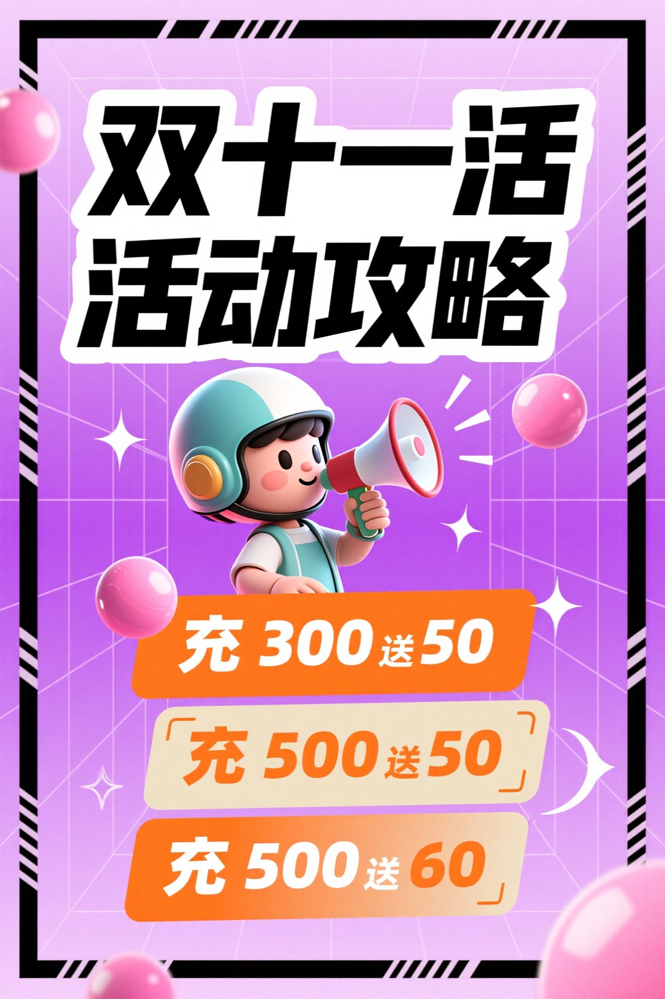 作品描述:科技感活动攻略风格,竖版海报,紫粉渐变网格背景,戴头盔持喇叭的卡通人物,“双十一活动攻略” 黑白艺术字,下方分层橙色 / 米色促销牌(“充 300 送 50”“充 500 送 60” 等,附带赠品说明),点缀粉色球体、星光元素,未来感十足。