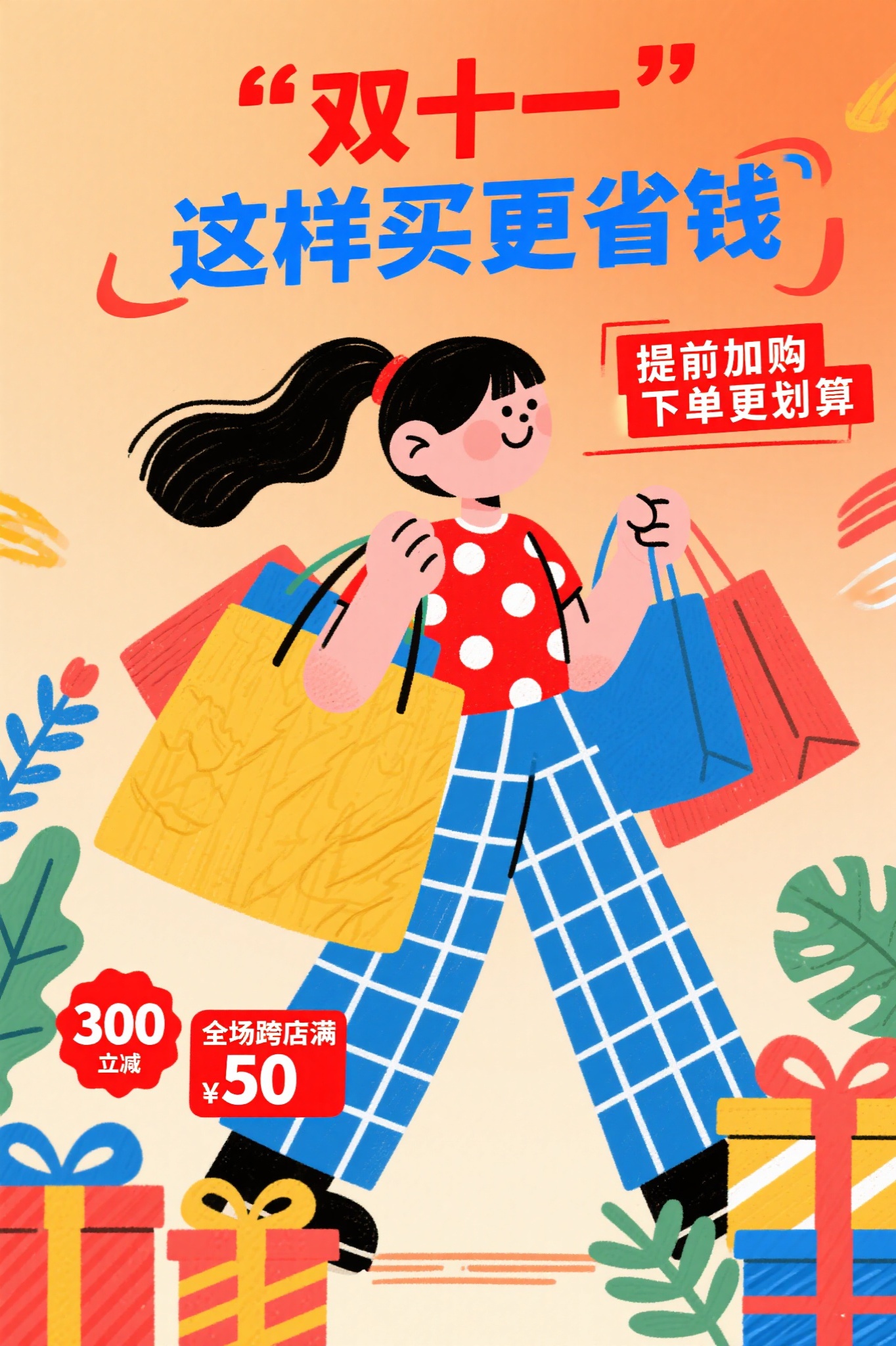 作品描述:手绘促销风格,竖版海报,暖橙色渐变背景,扎高马尾的卡通人物穿红波点上衣与蓝格裤,双手拎满带肌理的黄 / 蓝 / 红购物袋,上方 “双十一 这样买更省钱” 笔触活泼的红蓝字,右侧 “提前加购 下单更划算” 红框文字,左下角 “全场跨店满 300 立减 50” 红标,点缀礼盒与植物元素,营造热闹省钱攻略氛围。
