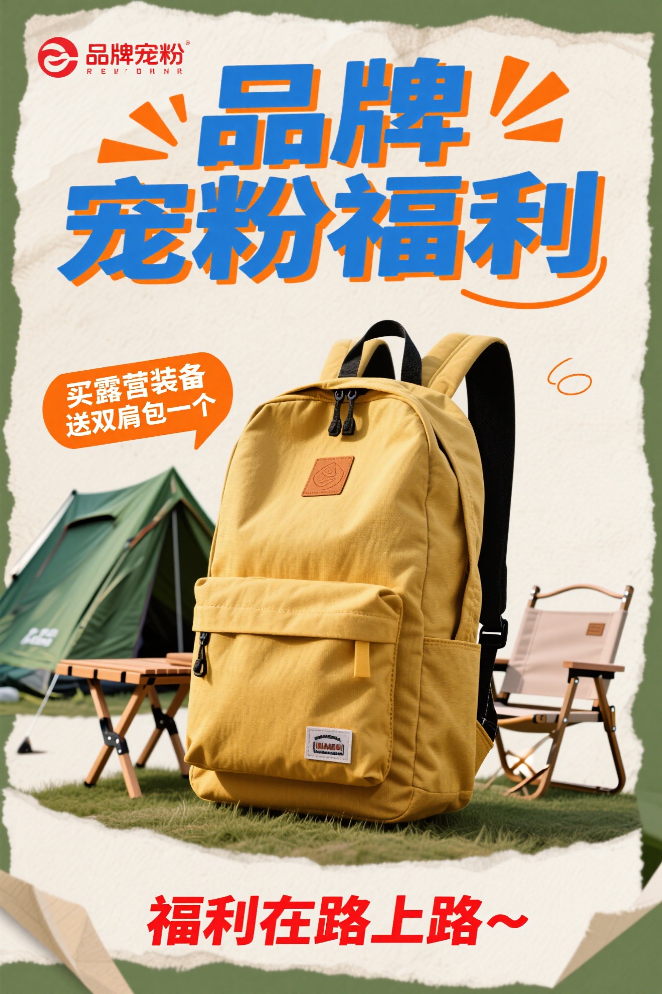 作品描述:实景宠粉风格,竖版海报,复古纸张背景,主体为布料纹理清晰的黄色双肩包,旁侧展示绿帐篷、木折叠椅等露营装备,上方 “品牌宠粉福利” 蓝橙艺术字,左侧 “买露营装备 送双肩包一个” 橙标,底部 “福利在路上~~” 红文字,风格实用促销。