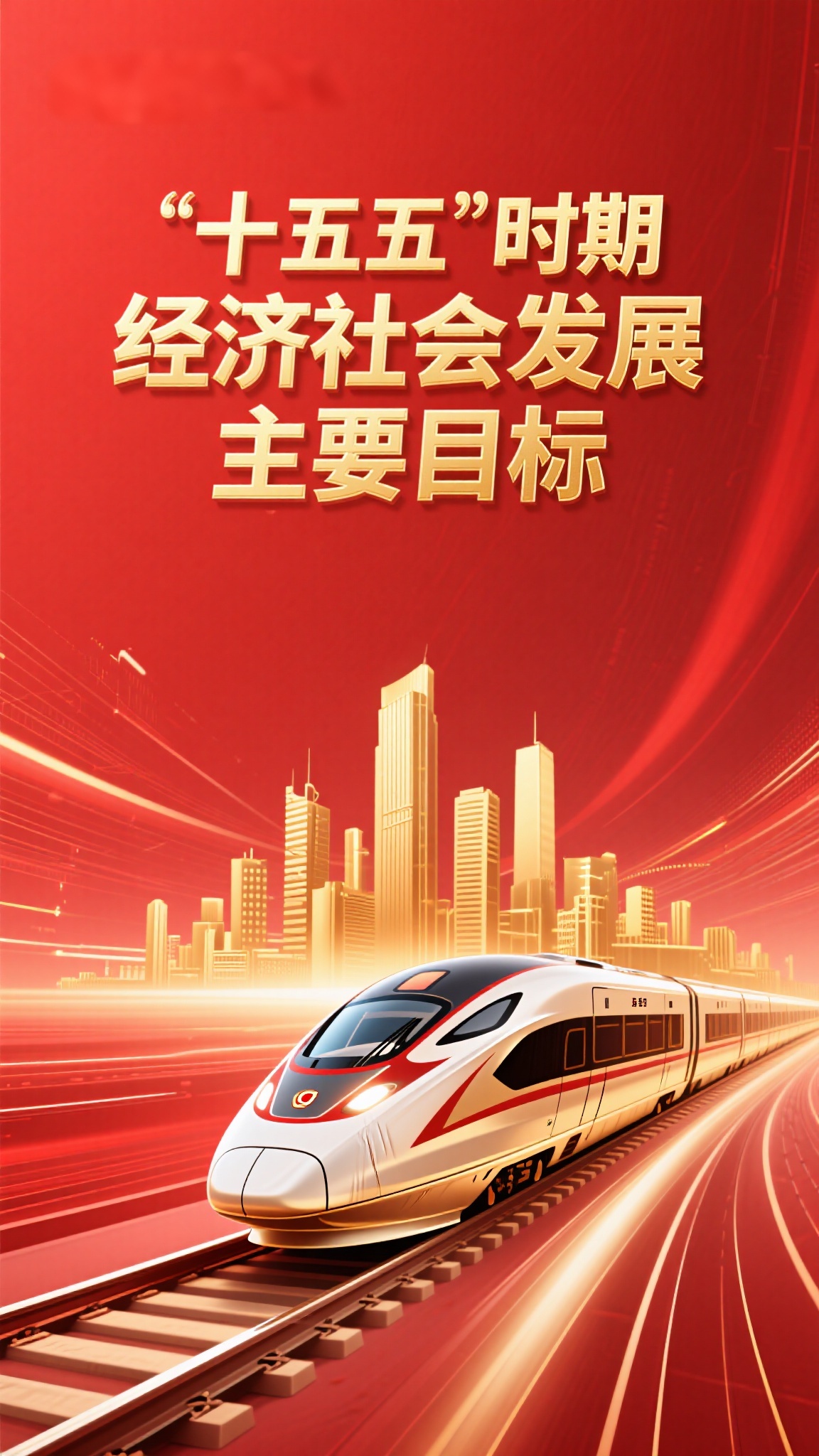作品描述:党建政务风格,竖版设计,红金配色,背景红色渐变(带科技线条);上方 “‘十五五’时期 经济社会发展主要目标” 金色立体字;下方流线型现代化高铁(质感细腻)行驶在轨道上,背景叠加金色抽象城市天际线;营造奋进的现代化发展氛围。