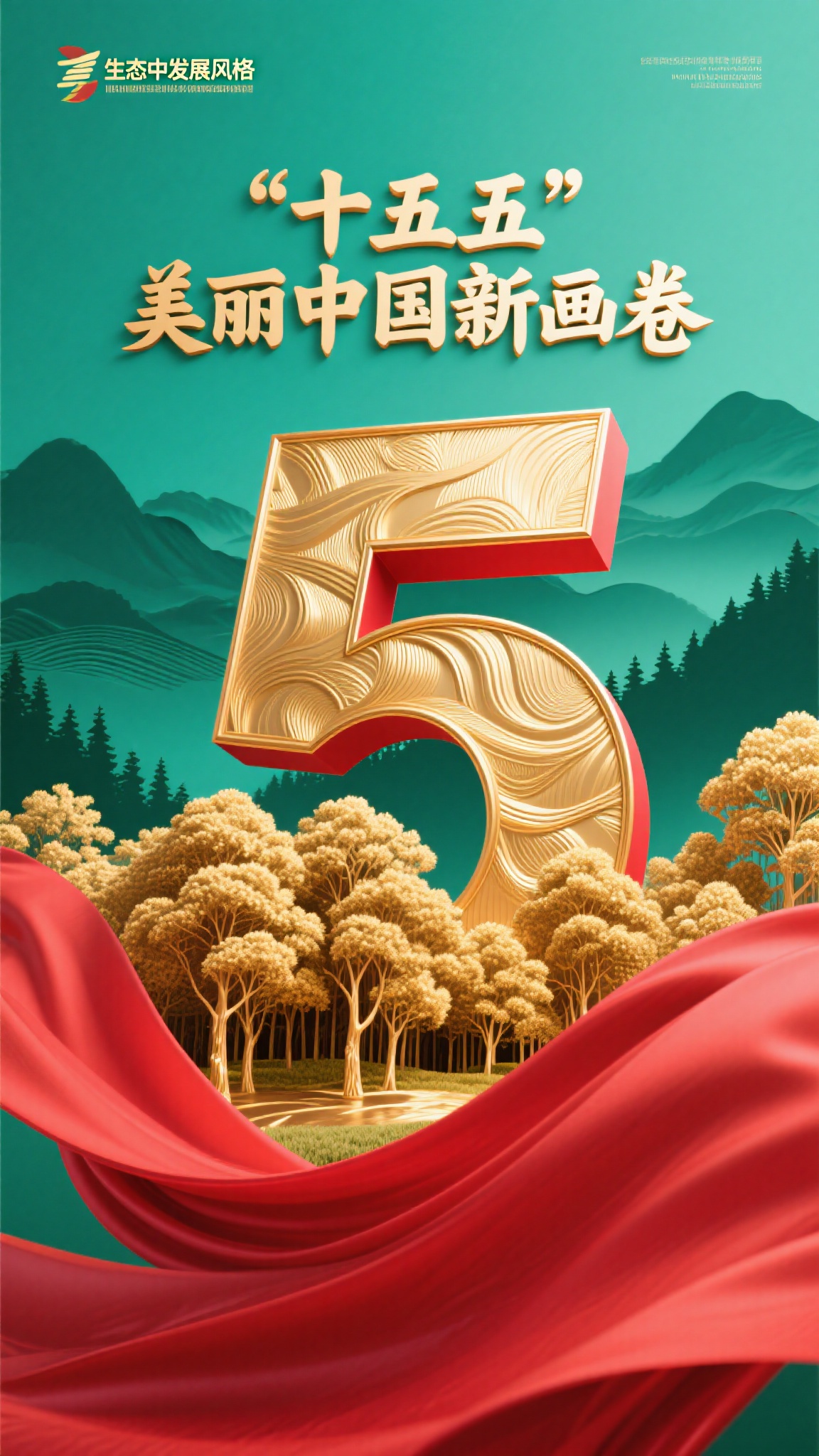 作品描述:生态发展风格,红金与青绿搭配,核心元素为纹理精致的金色森林(树木鲜活)与红绸,中央 “‘十五五’ 美丽中国新画卷” 立体字,搭配山水剪影,体现绿色发展理念。