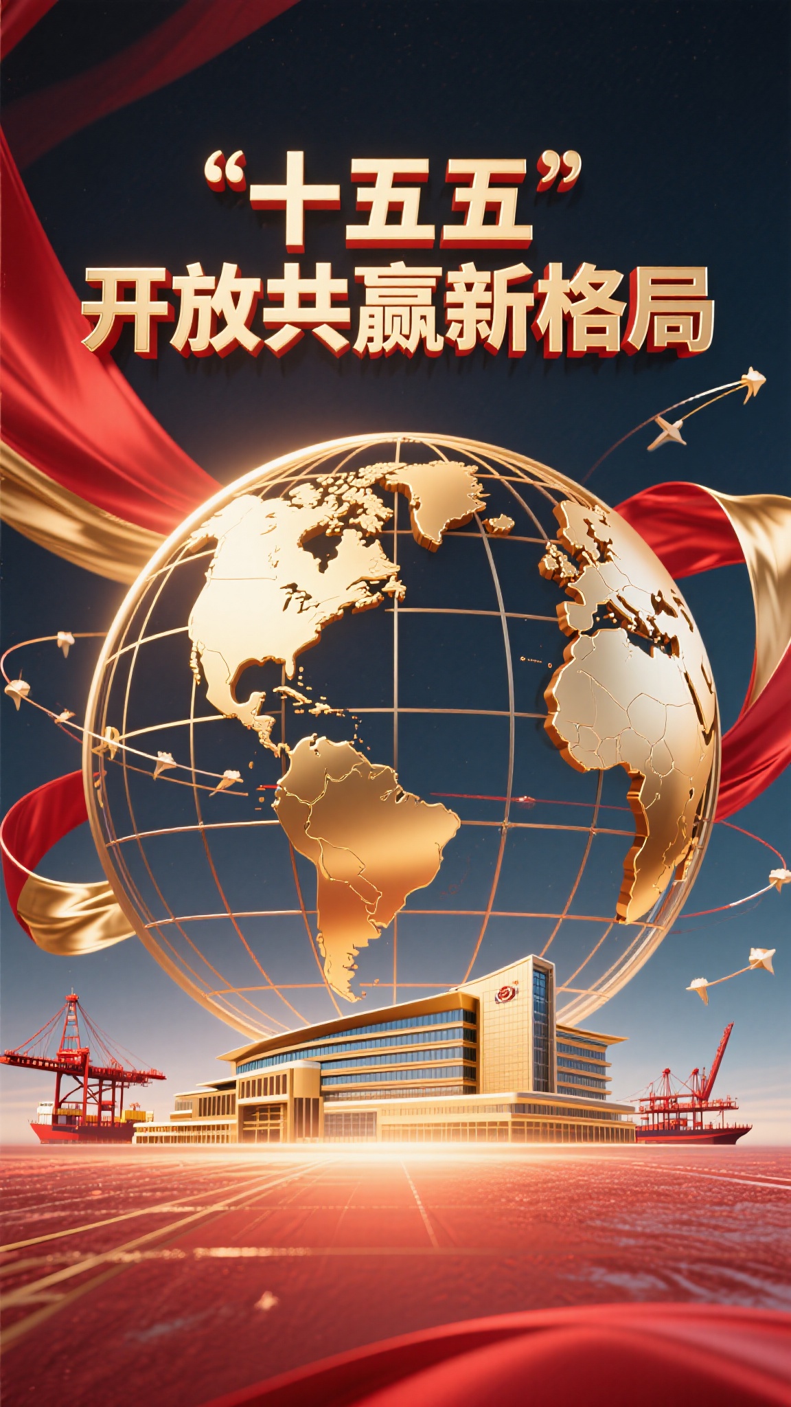 作品描述:开放合作风格,红金国际感背景,核心元素为经纬线清晰的金色地球与国际商贸建筑(港口、自贸区建筑),上方 “‘十五五’ 开放共赢新格局” 立体字,背景叠加红金飘带与全球航线,体现开放战略。