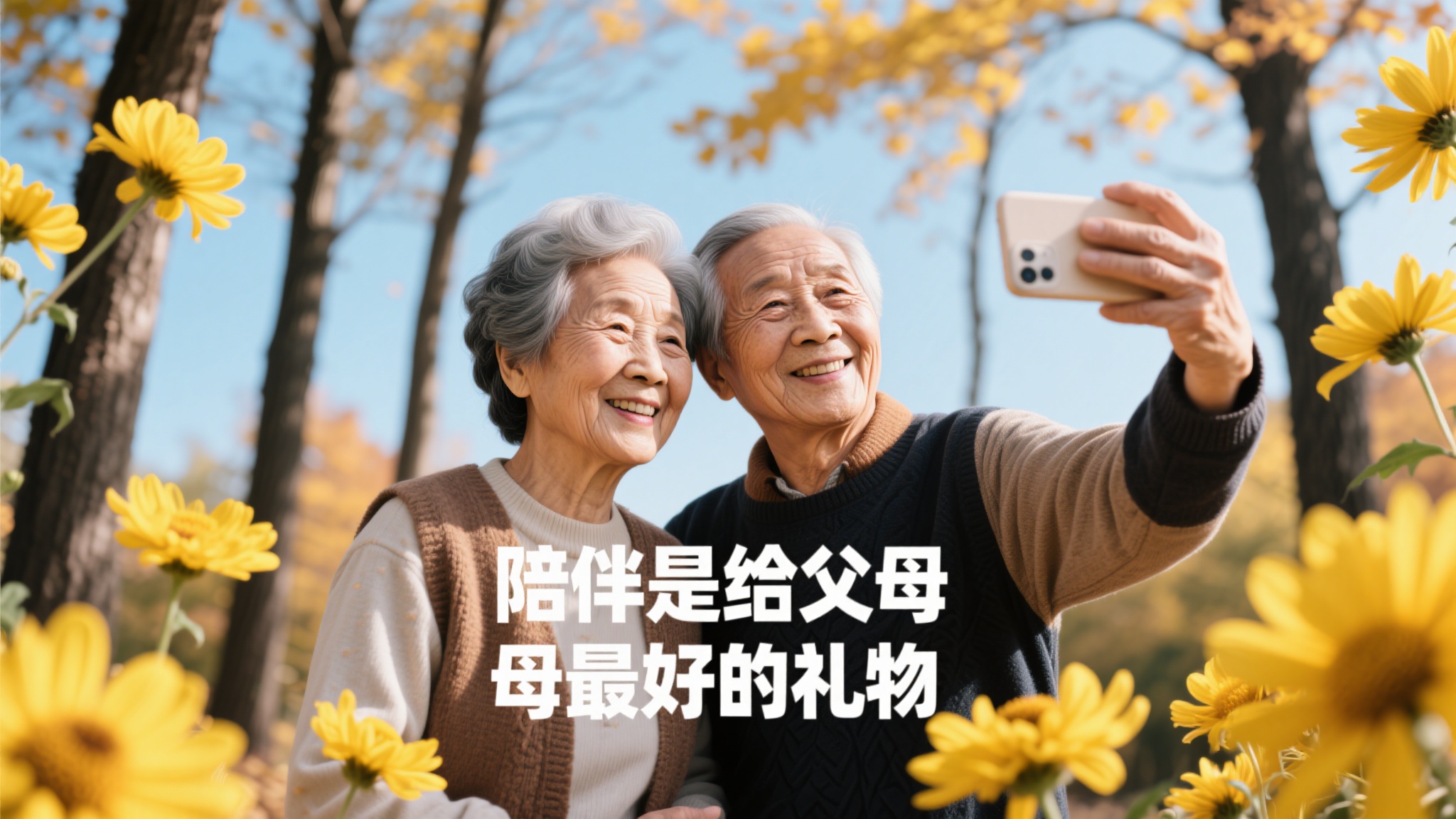 作品描述:现代简约风格,一对老人在秋日树林自拍,周围金黄菊花环绕,配文 “陪伴是给父母最好的礼物”,风格清新,体现节日里的温馨互动。