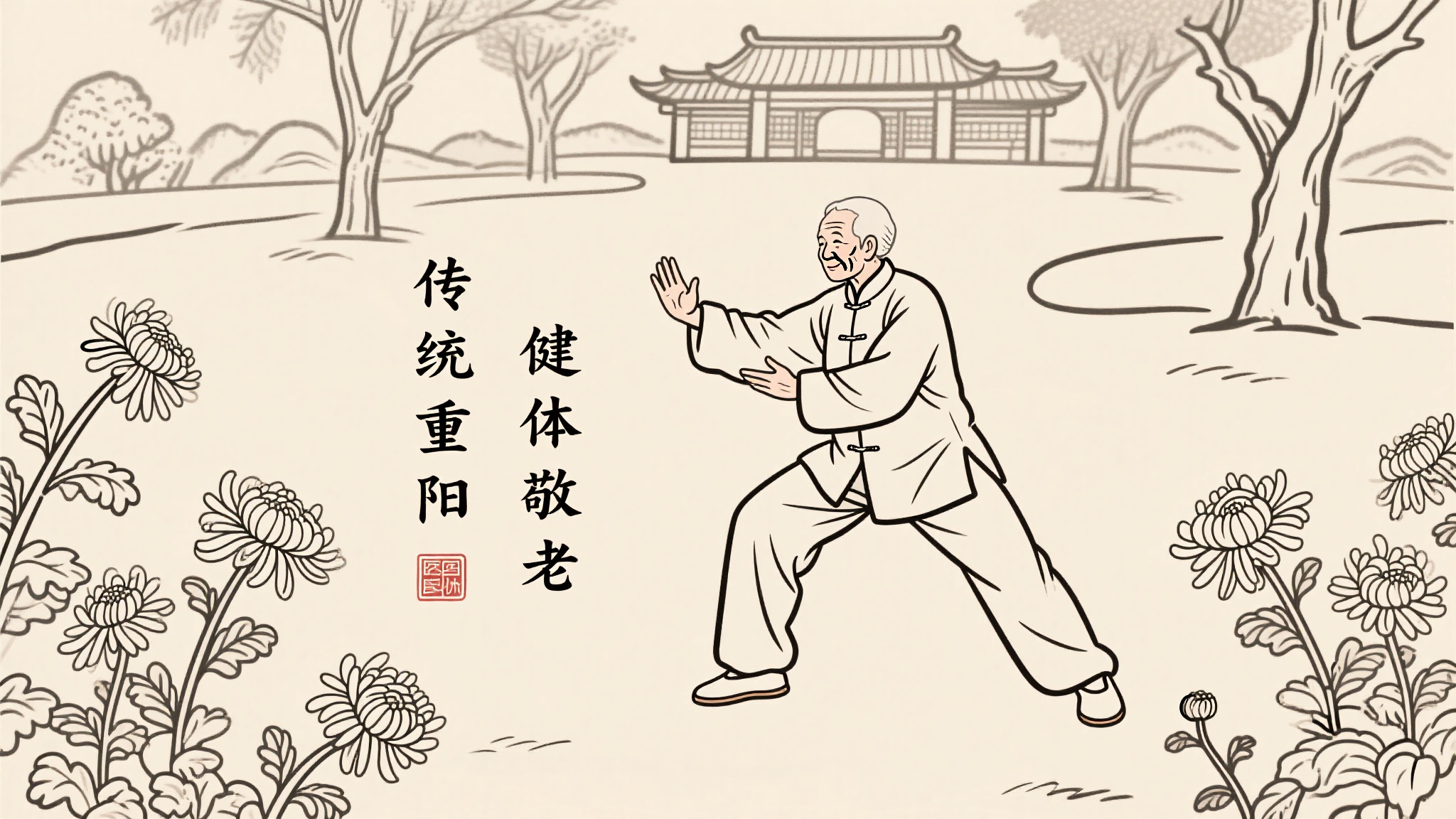 作品描述:国风线稿风格,老人于公园练太极,周围菊花盛开,线条流畅简洁,配文 “传统重阳 健体敬老”,尽显中式韵味。