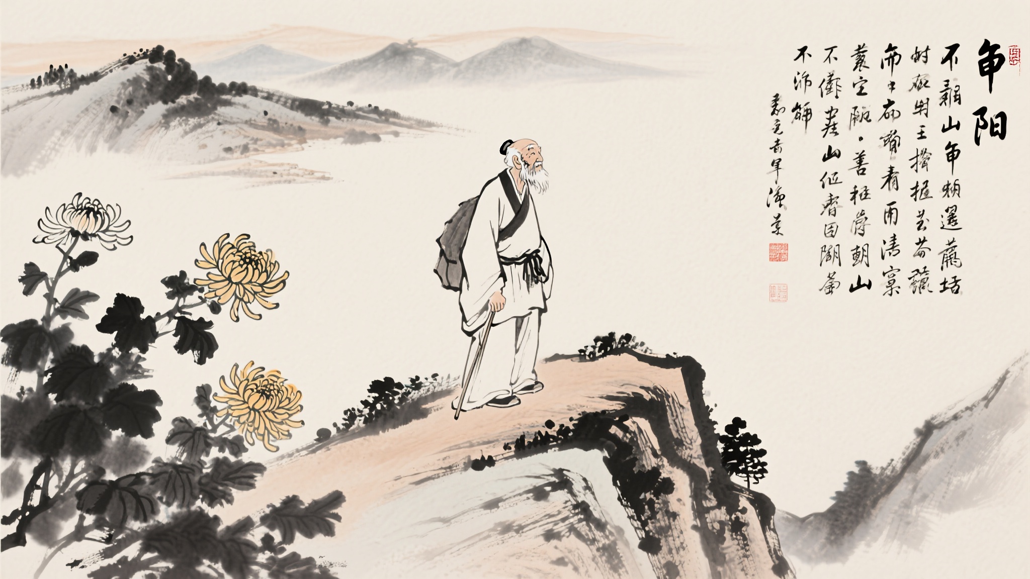 作品描述:复古水墨诗词风格,重阳登高图配古典诗词,老人立于山间,笔墨苍劲,菊花、远山以水墨晕染,尽显传统文化底蕴。
