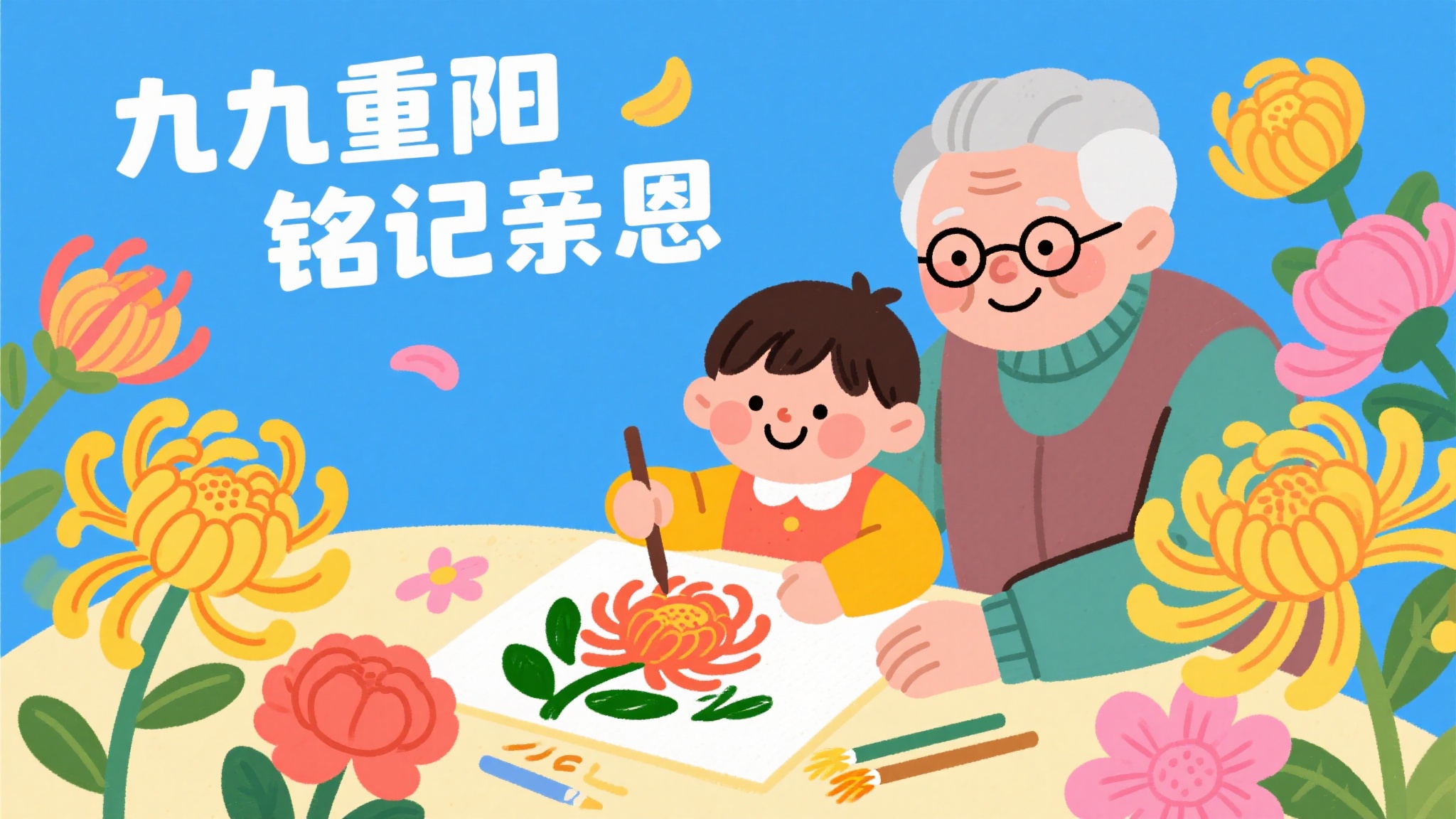 作品描述:童趣插画风格,小孩陪老人画菊花,画面色彩明快,充满童真,配文 “九九重阳 铭记亲恩”,突出代际互动的温暖。
