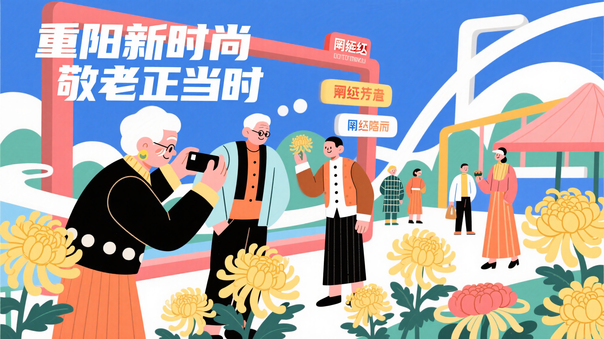 作品描述:时尚插画风格,老人身着时尚服饰,在网红打卡点赏菊拍照,画面现代感强,配文 “重阳新时尚 敬老正当时”。