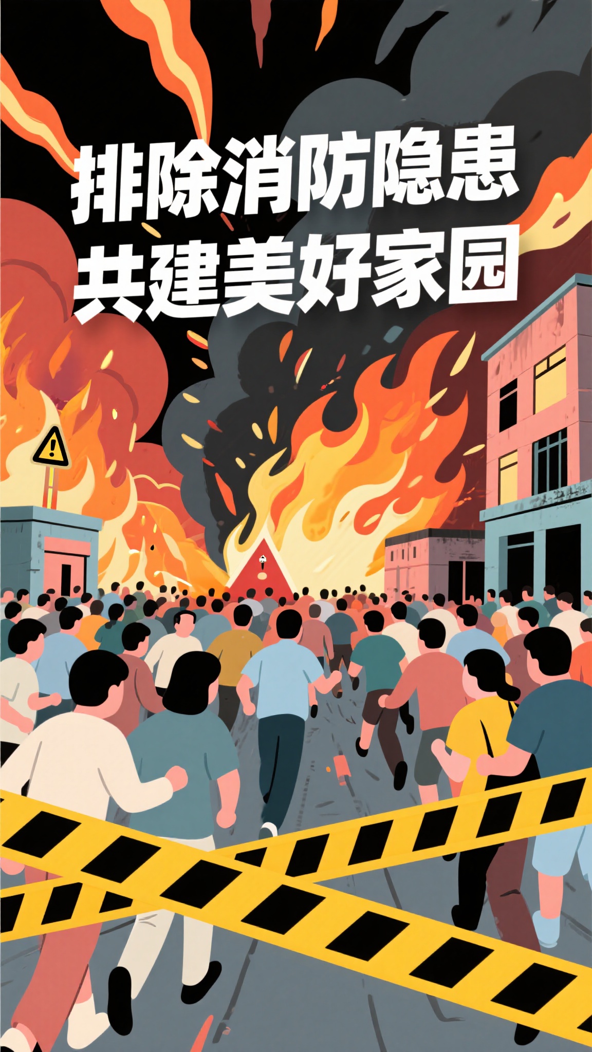 作品描述:警示插画风格,火灾爆炸场景中人群紧急疏散,黑黄警示带强化危险边界,搭配 “排除消防隐患 共建美好家园” 醒目白字,画面冲击力强,传递隐患排查的紧迫性。