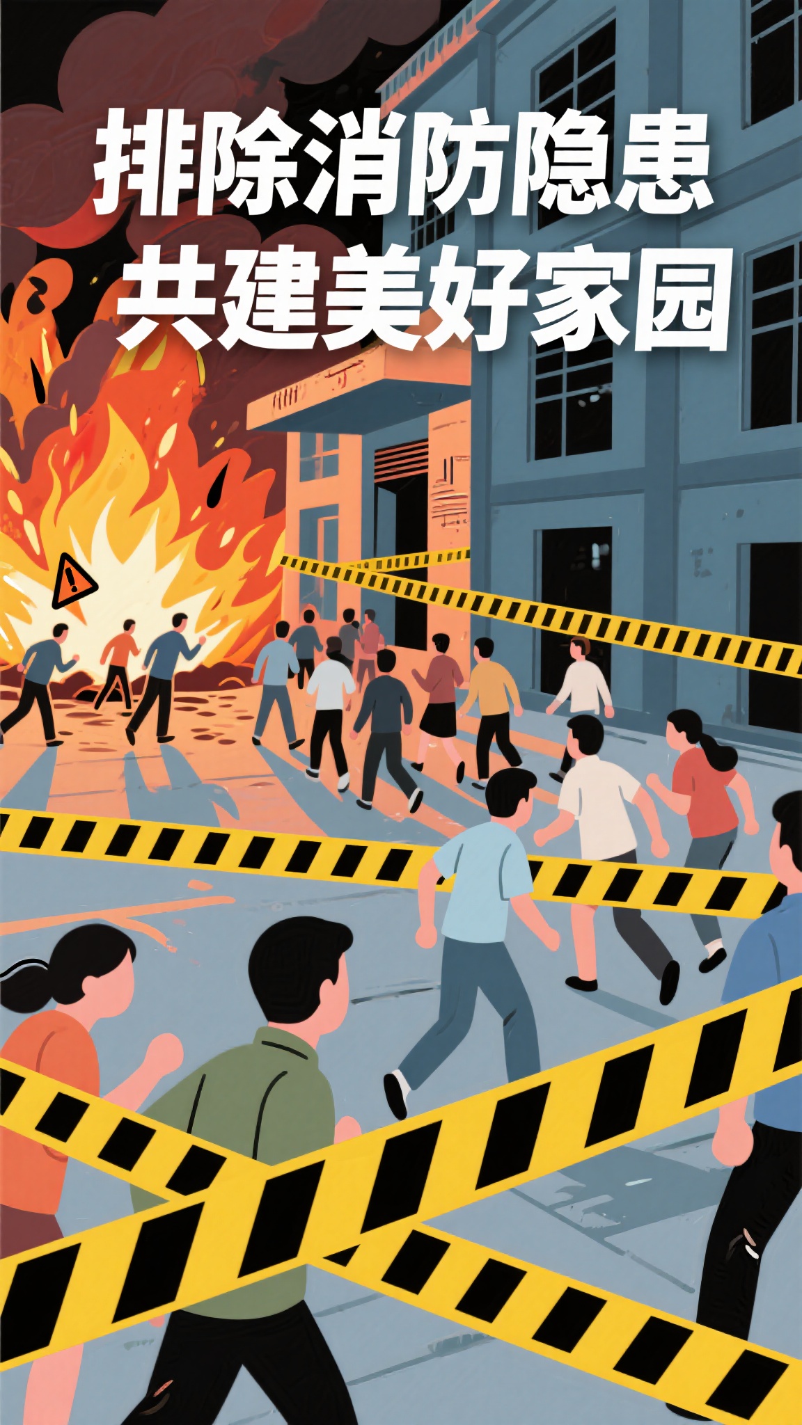 作品描述:警示插画风格,火灾爆炸场景中人群紧急疏散,黑黄警示带强化危险边界,搭配 “排除消防隐患 共建美好家园” 醒目白字,画面冲击力强,传递隐患排查的紧迫性。